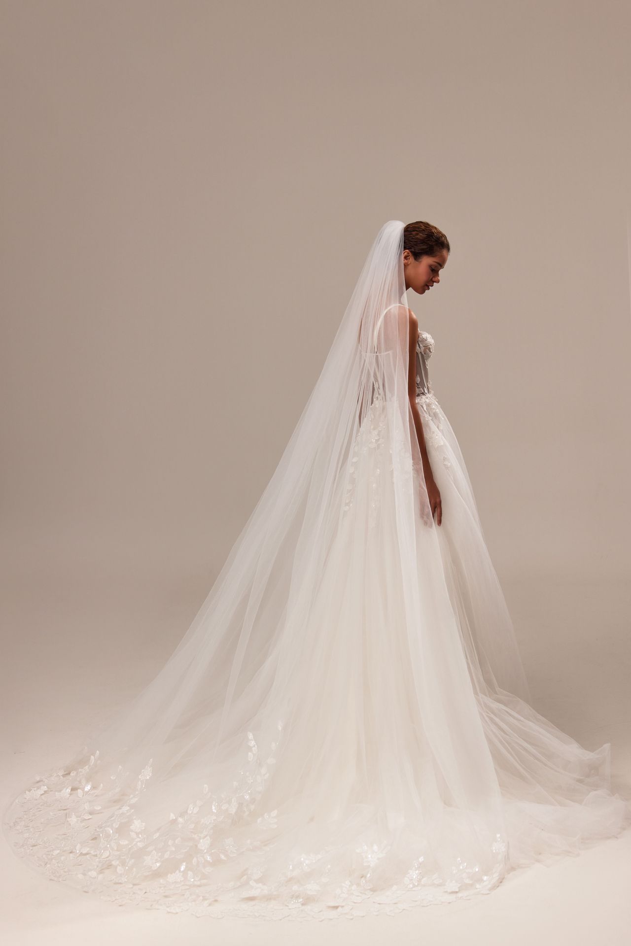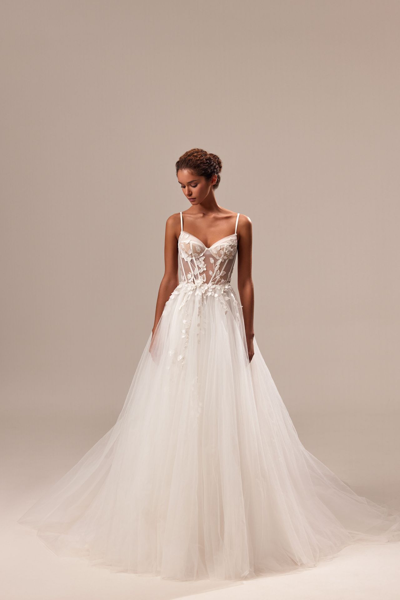 Spaghetti strap wedding gown with a tiered puffy tulle skirt and molded corset with built-in cups. The A-line silhouette flares with lace flowers from the semi-transparent bodice to a voluminous tulle skirt. Can be complimented by the long veil embellished with 3D flowers and sequins.