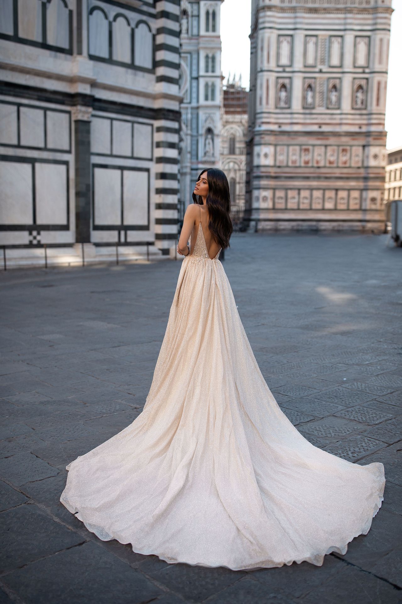 Spaghetti straps sparkling A-line gown with a daring plunging neckline, sequined lace corset with side cuts, an open back, and maxi skirt with a long striking train. Available in gold and silver color.