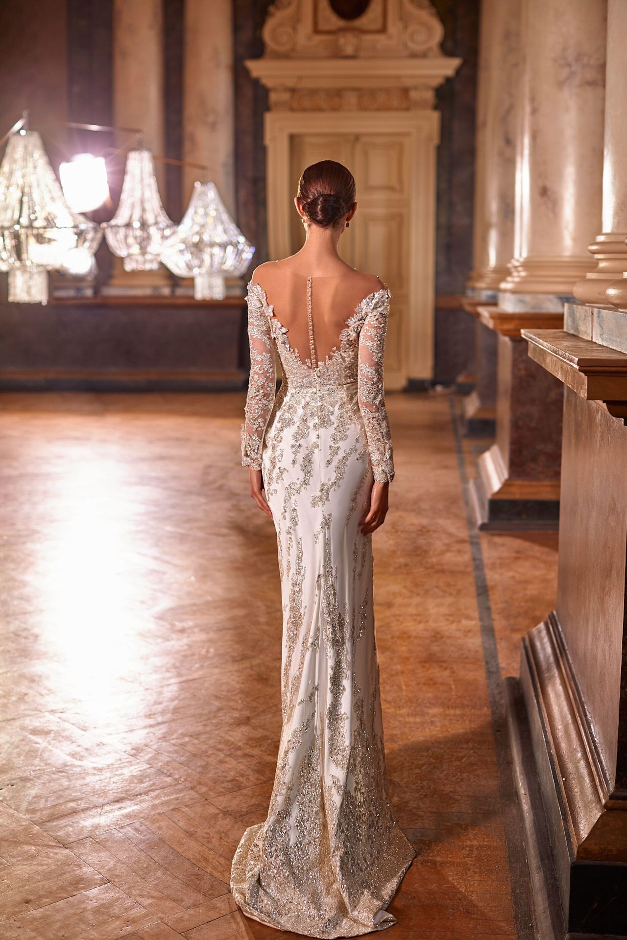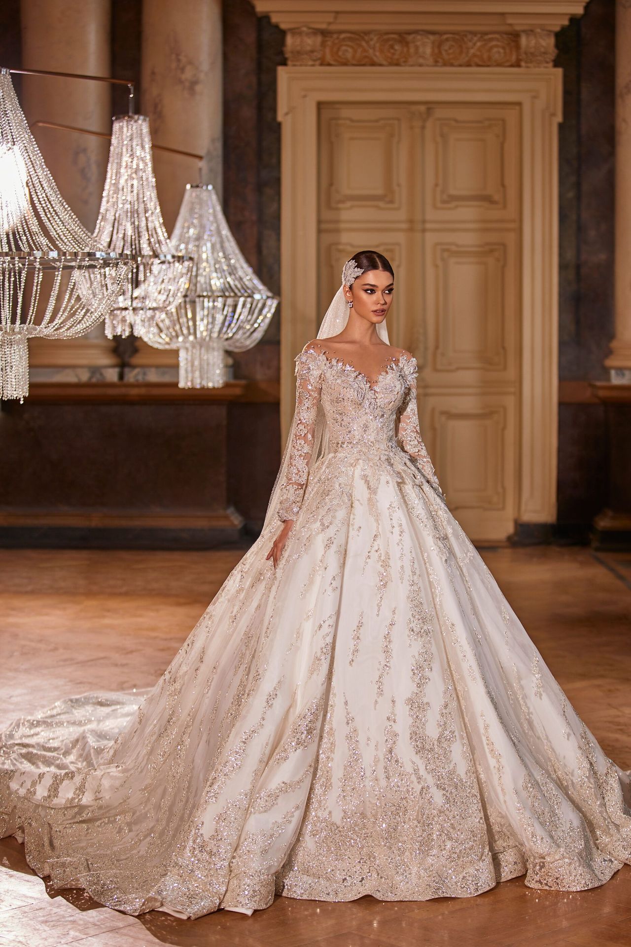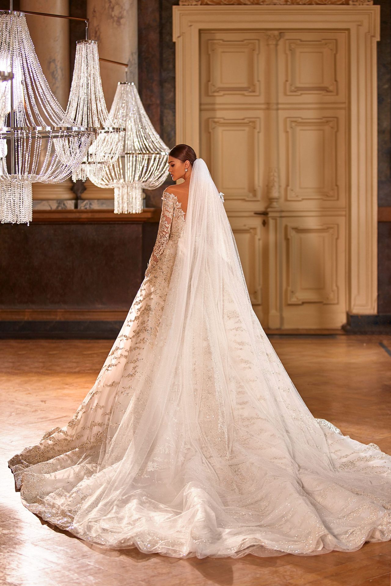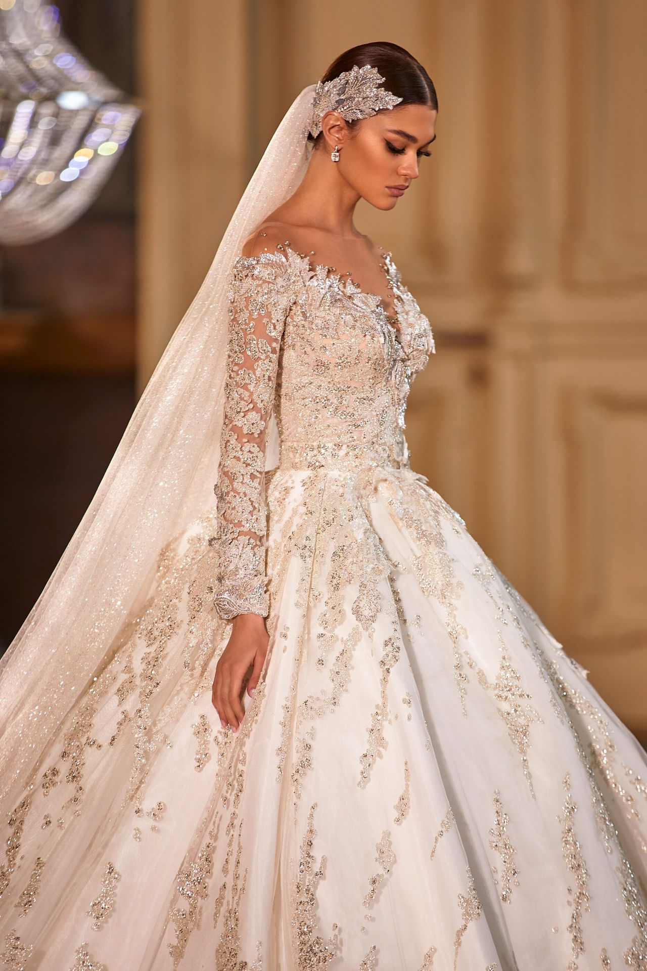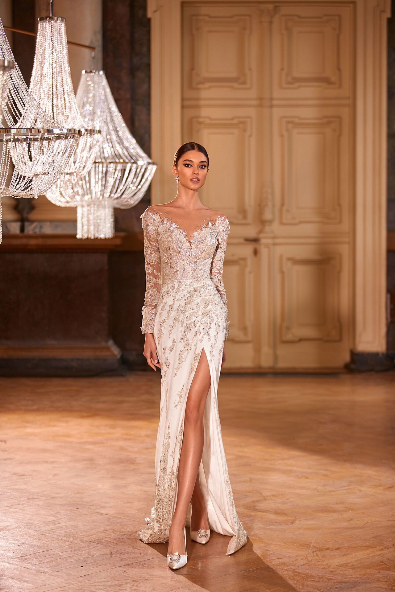 Feminine embellished wedding dress with a thigh slit in white colour with a heart-shaped neckline, beaded semi-transparent long sleeves, and an open back.Complemented with a detachable fully adorned ballgown overskirt.
