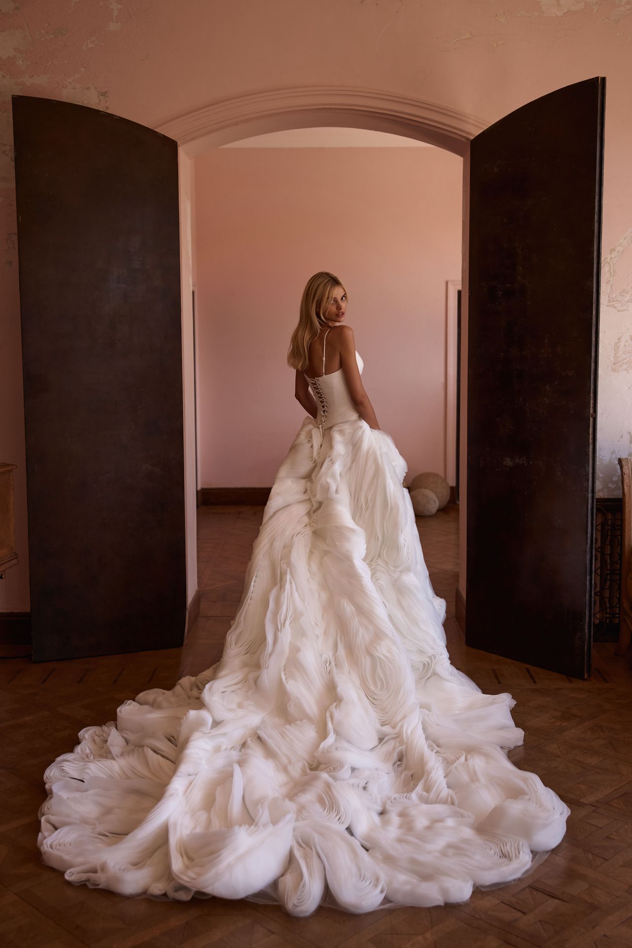 Extraordinary wedding ensemble boasting a dramatically voluminous skirt with a sweeping train and a heart-shaped, delicately draped corset on adjustable spaghetti straps. The corset includes a lace-up closure for a customized fit. The skirt is crafted from meticulously placed organza flounces designed to mimic the natural flow of feathers. The creation of the skirt involves a complex, many-hour process of preparing each element.