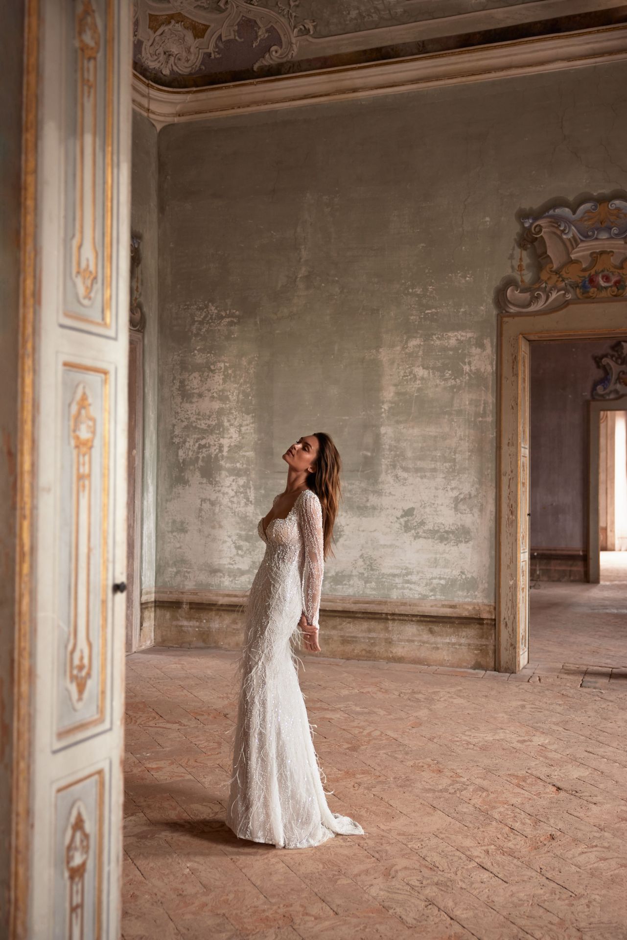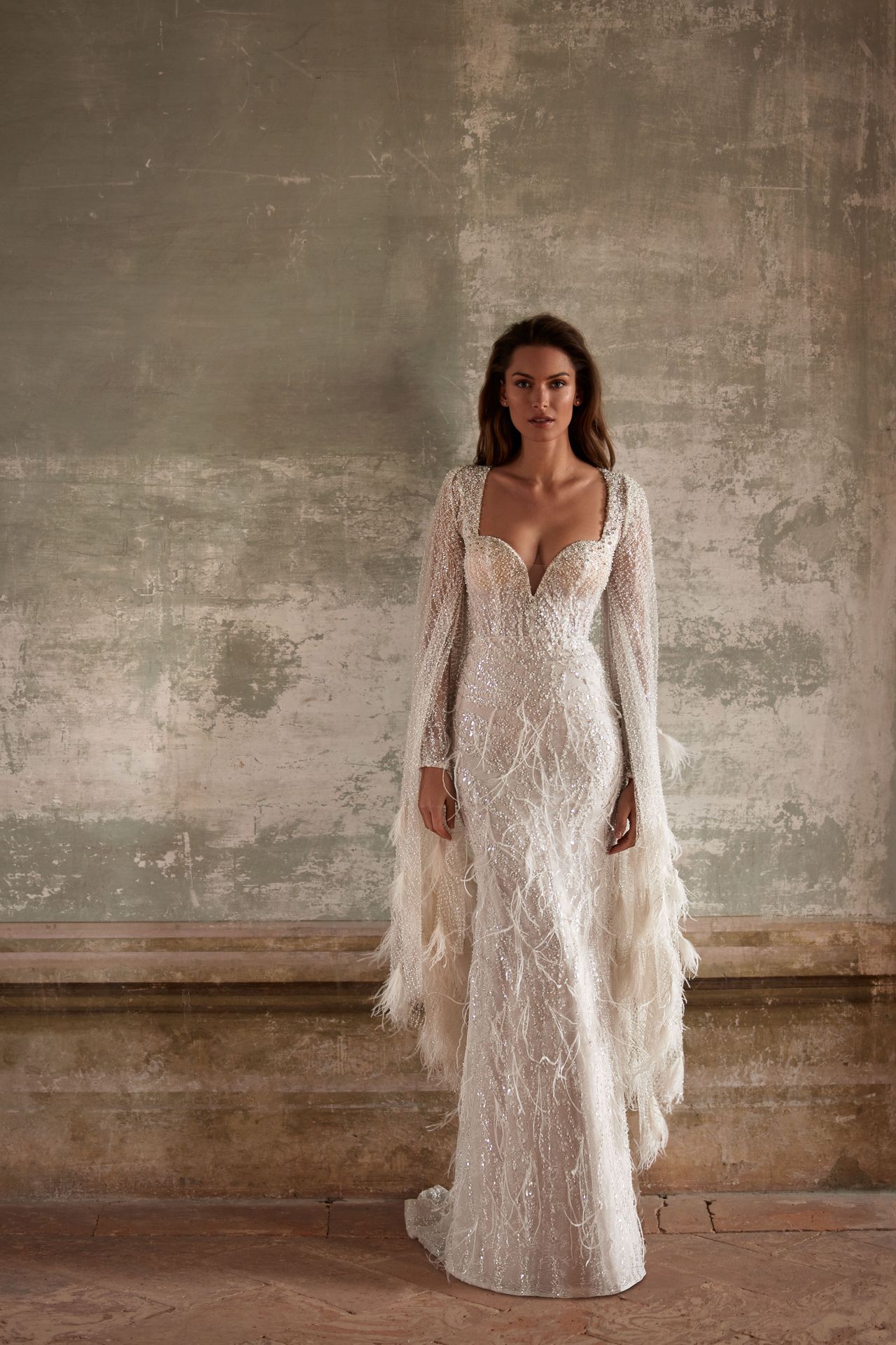 Sensational long-sleeved mermaid gown made from semi-transparent lace with a floral pattern embroidered with sequins, beadings, and pearls. Featuring a plunging neckline, a zip closure on the closed back, and a romantic feather-embellished skirt with a delicate train.