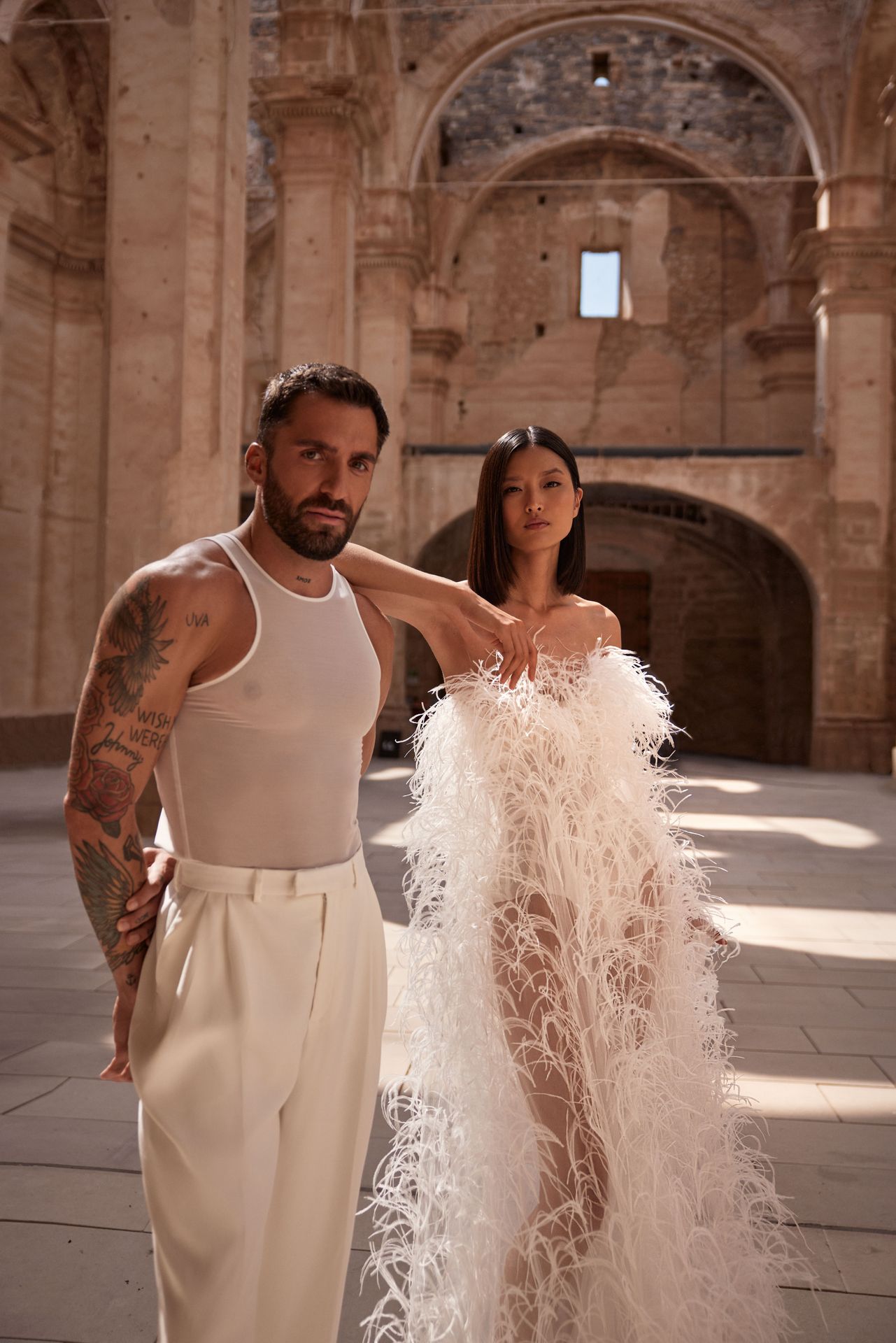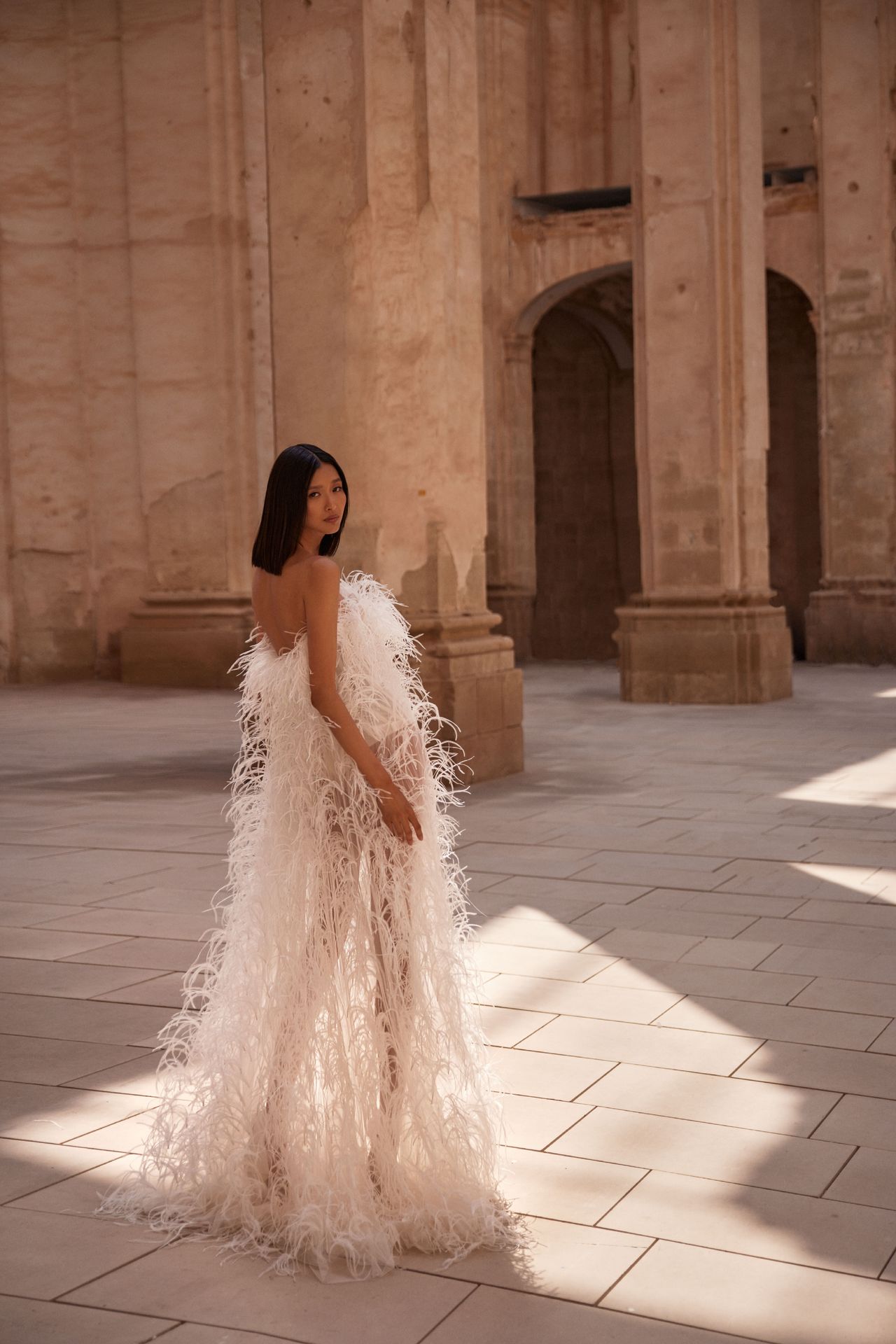 Diva semi-transparent multi-layered lace gown adorned with ostrich feathers by hand, creating a light yet structured silhouette. The statement sleeveless design highlights the shoulder line, with a semi-transparent construction underneath.