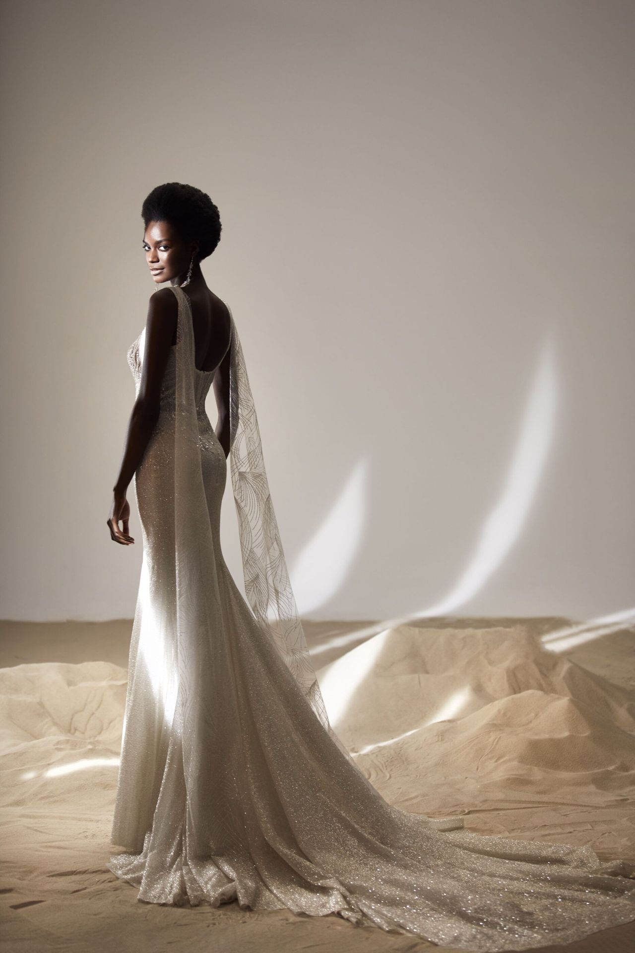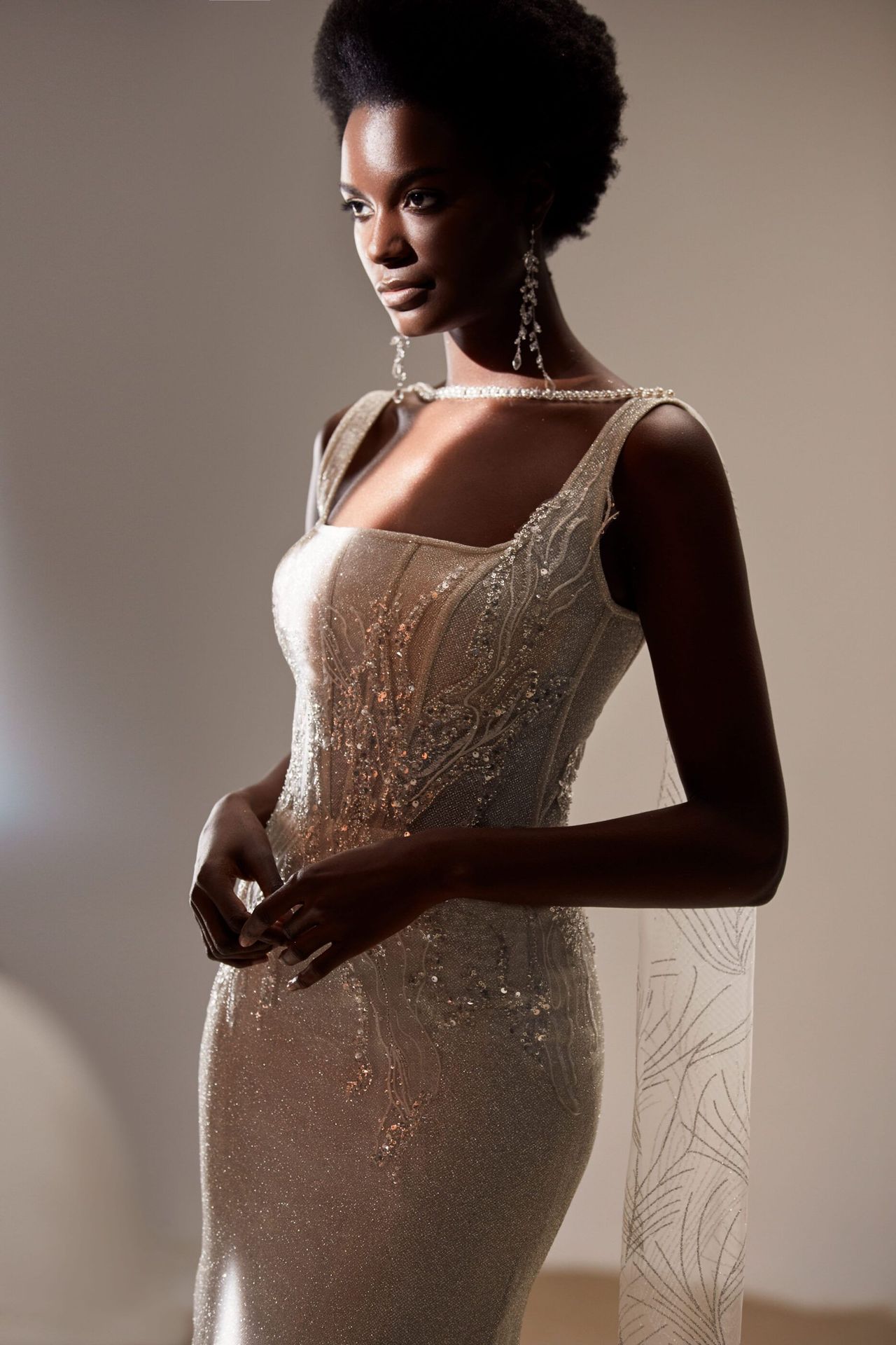 Mermaid glitter wedding dress with square neckline, decorated with lace and beading and has long train. Complemented with a delicate shoulder accessory.
