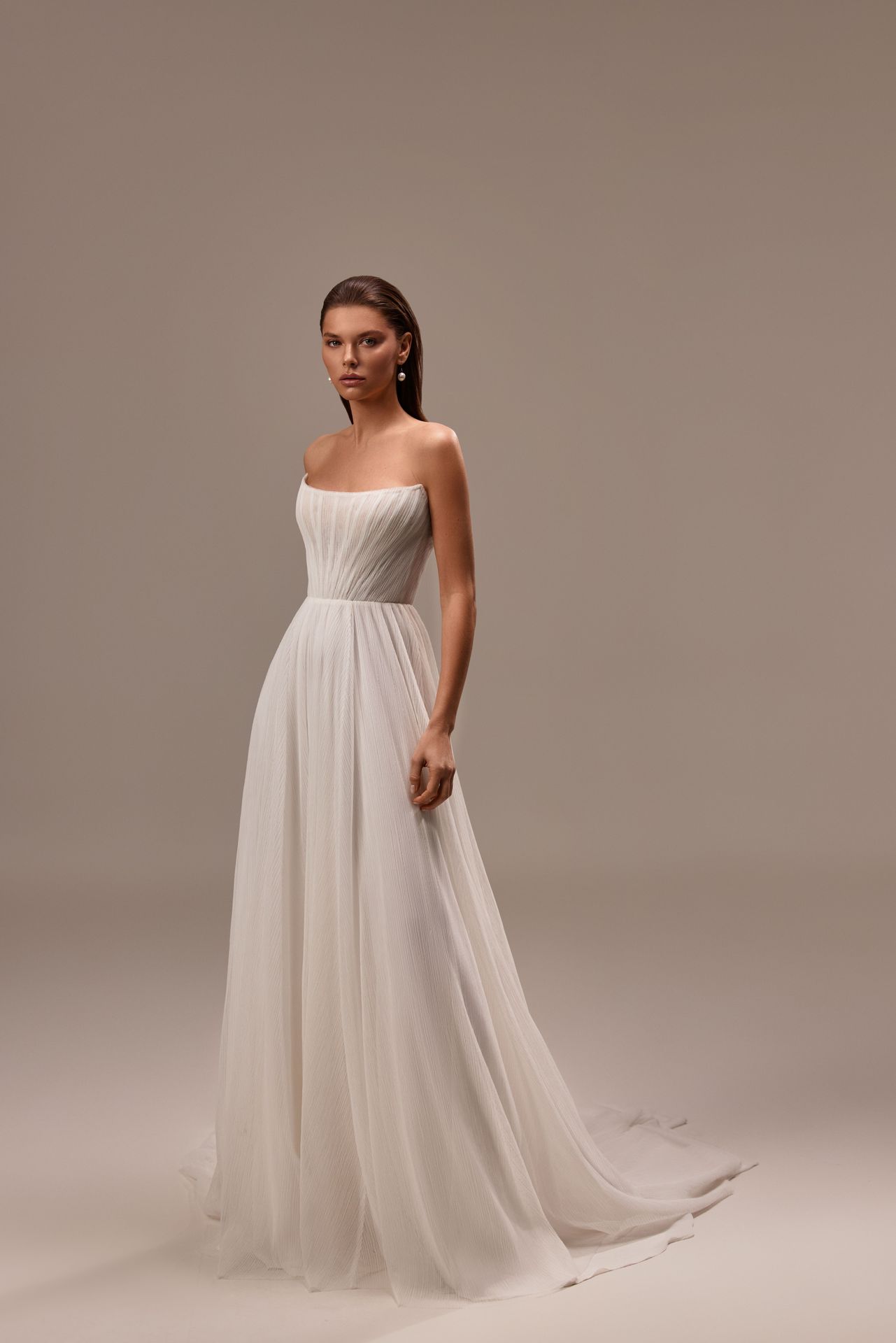 Marvelous strapless wedding gown made from hand-pleated tulle. Featuring a boned geometric corset with a closed sheer zipper back, and an airy tulle skirt with a midi train. The look is complemented by an exceptional long-sleeved cape adorned with beadings.