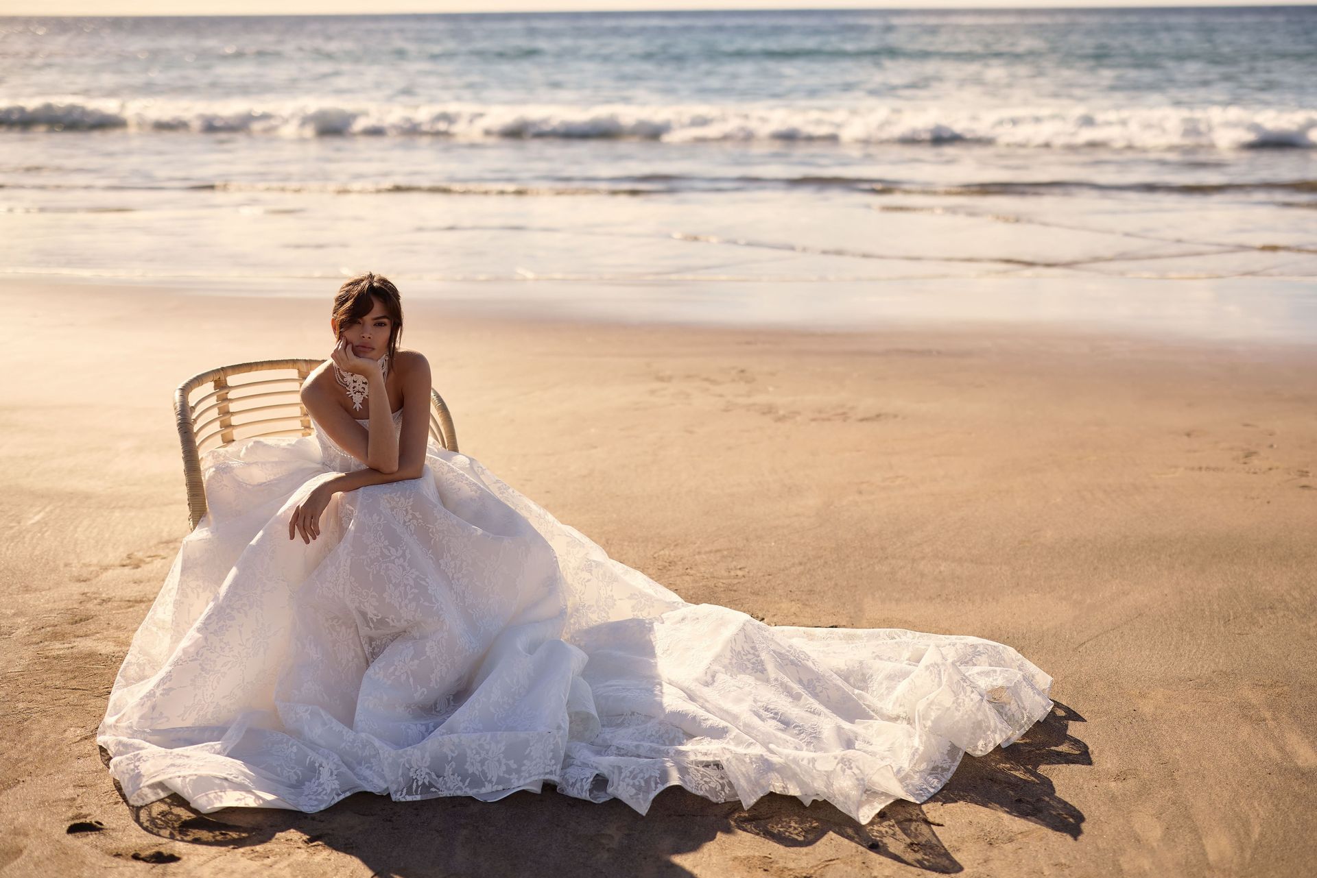 Vintage-inspired exquisite wedding gown cut in a princess silhouette from delicate chantilly lace. Featuring a straight neckline, a structured bodice with built-in cups and visible boning that lengthens the silhouette, a zip closure, and a voluminous lace skirt with a train that flares out from the corset. This ballgown features a baroque-inspired ornament embellished with sequins. Includes detachable pearl jewelry for versatile styling — wear it on the corset or as a necklace. For a complete and romantic look, the gown can be styled with an exquisite lace Monica choker and ruched lace Monica cuffs. The dress includes detachable off-the-shoulder sleeves.