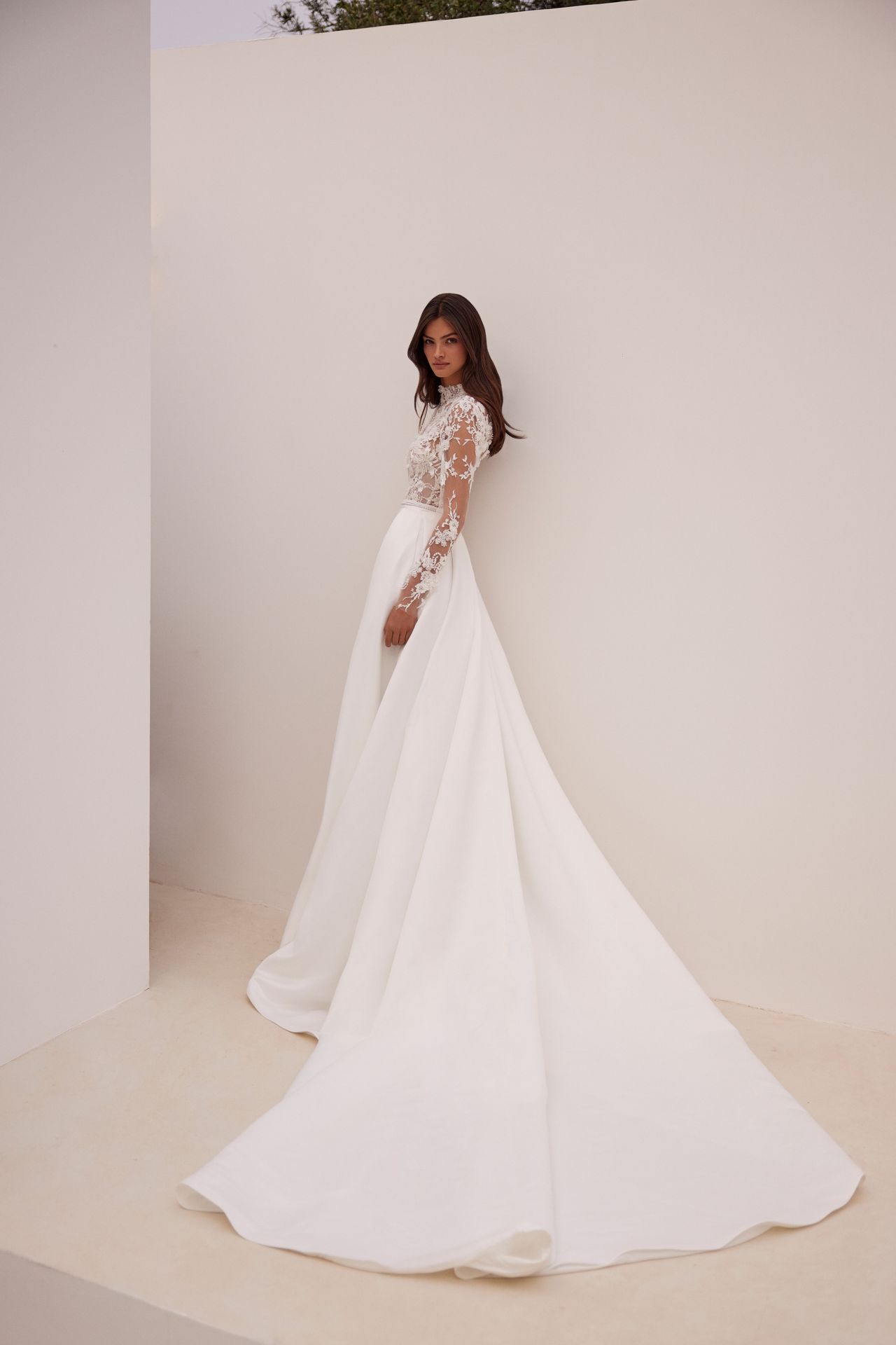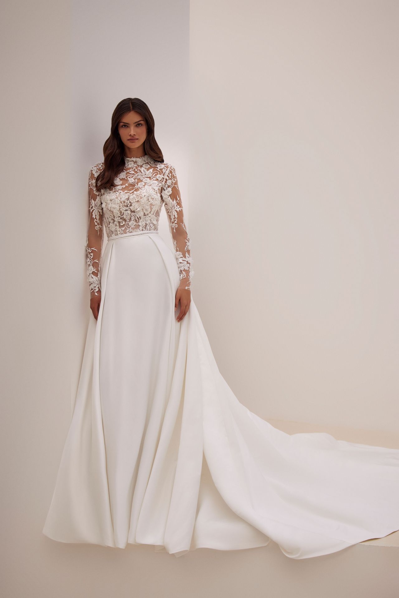 Romantic long-sleeved gown in A-line silhouette fully covered in glitter. Featuring a turtleneck bodice embroidered with lace flowers, sequins, and a lush princess skirt.