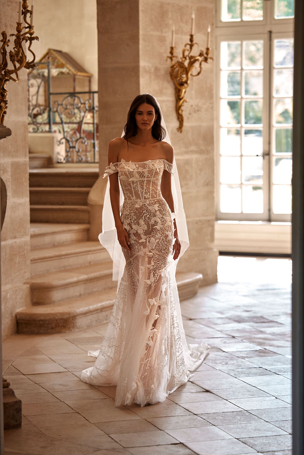 Fairylike off-the-shoulder wedding gown adorned with 3D butterflies, lace applique, beadings, and sequins. Features a mermaid silhouette, lace-up closure on the back, semi-transparent delicate striped top, and tulle skirt.