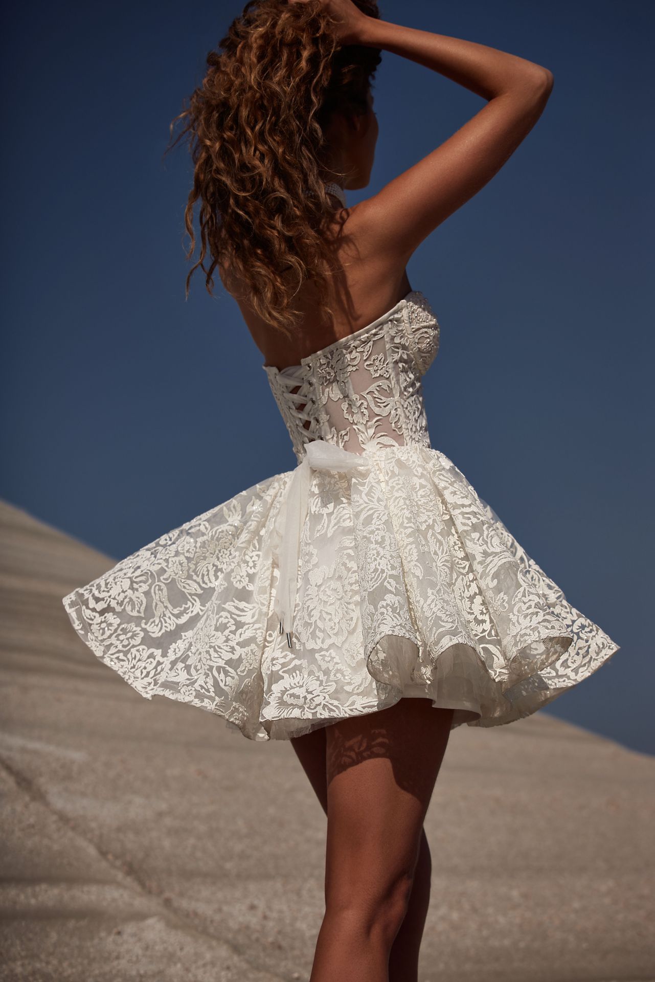 Adorable mini dress adorned with floral lace applique. Featuring a daring strapless decollete, a puffy skirt, and a lace-up closure on the back.