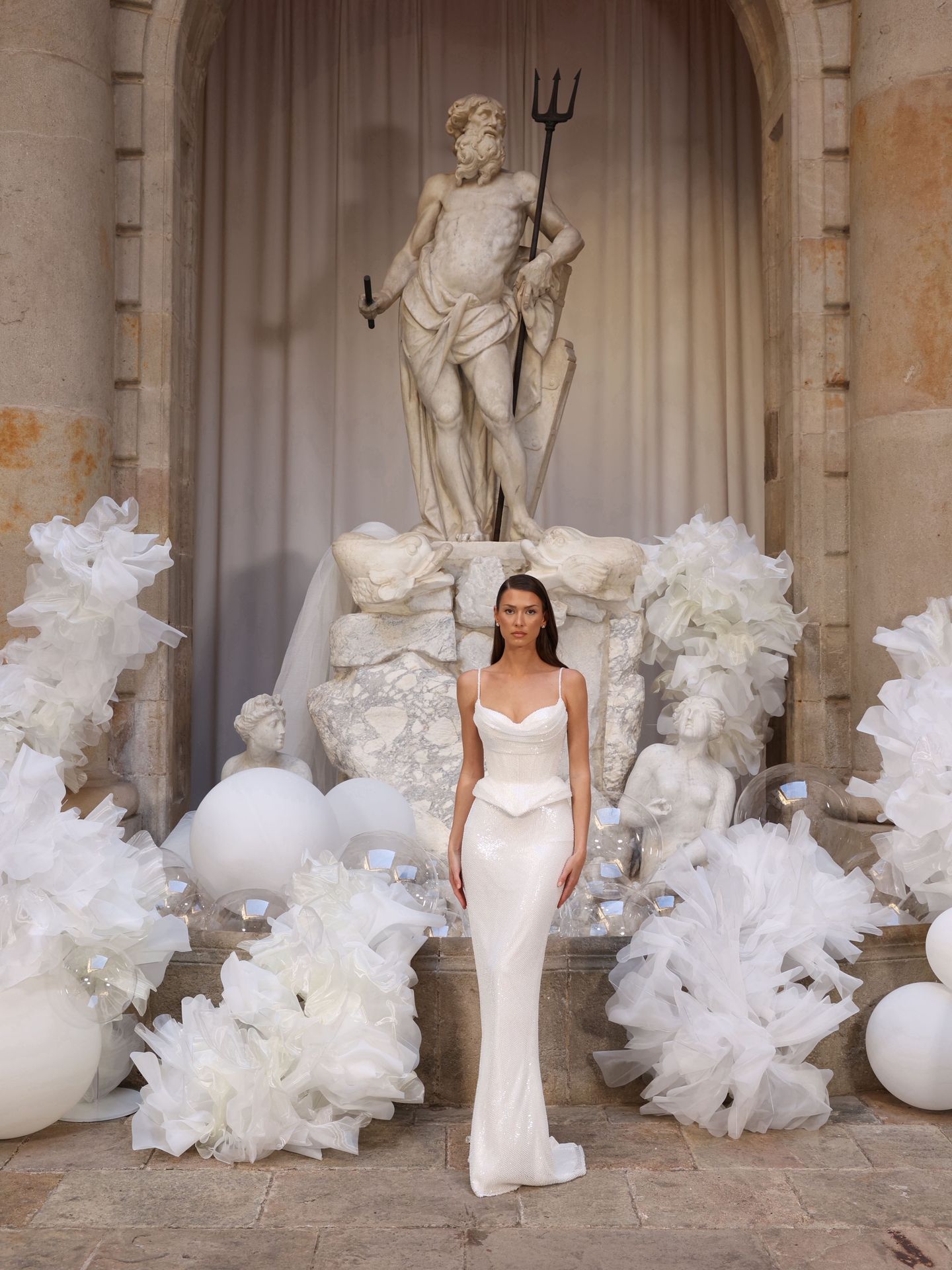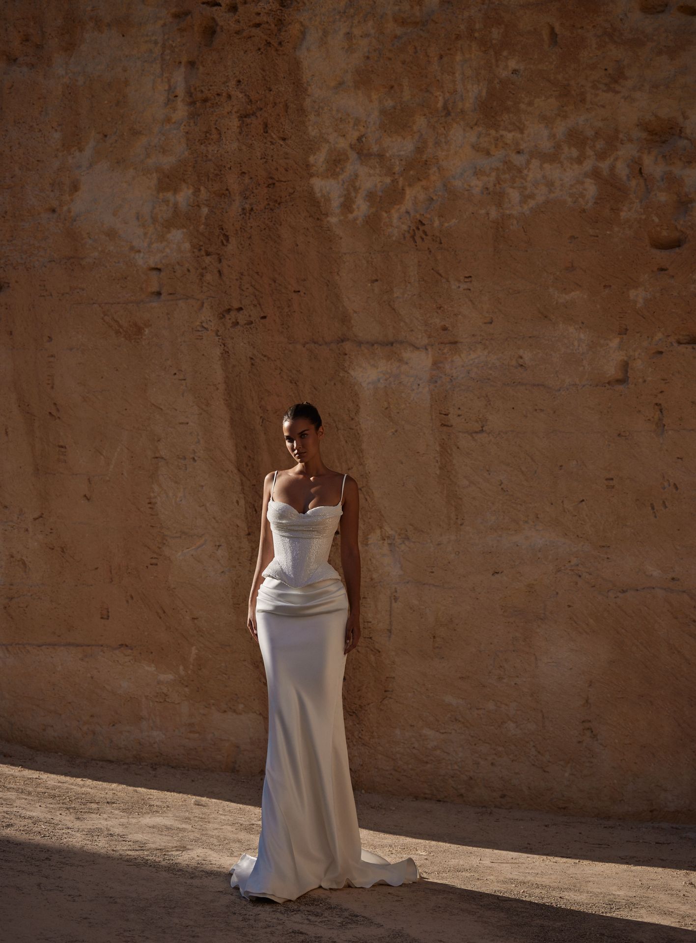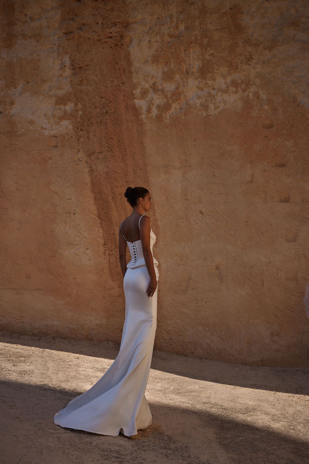 Chic statuesque two-piece wedding ensemble crafted from satin. The corset adopts a basca-style design, adorned entirely with sequins. It features a cinched drop waist, a heart-shaped neckline supported by delicate spaghetti straps, and a bonned structure. The look is finished with a flowing draped skirt featuring a midi-length train, elegantly framing the silhouette. The dress can be paired with a gala-worthy spaghetti strap long train Nancy embellished by hand with voluminous 3D tulle flowers.