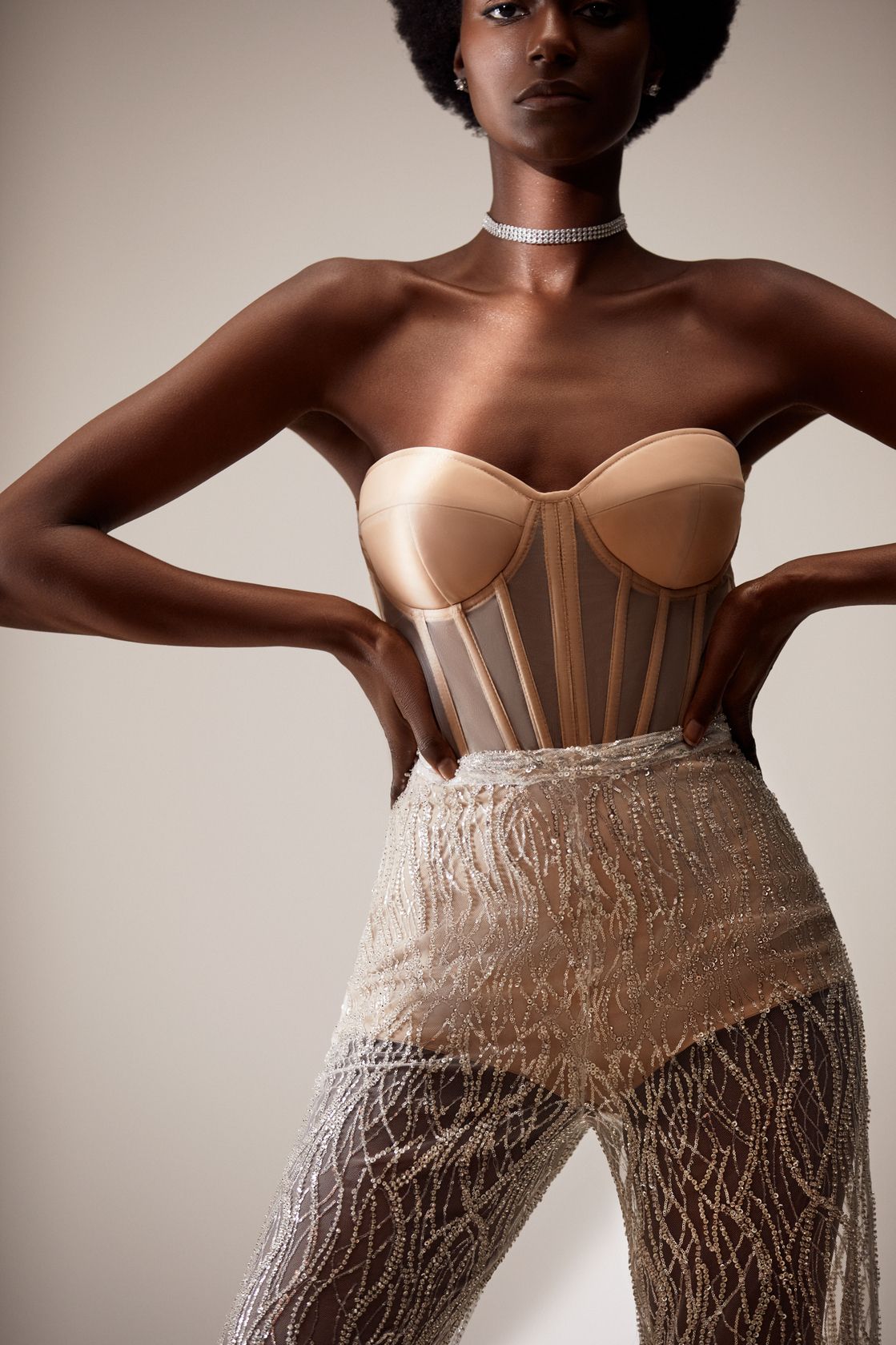 Wedding jumpsuit (nude corset, semi‑transparent pants and a vest). Available in nude or ivory color option.