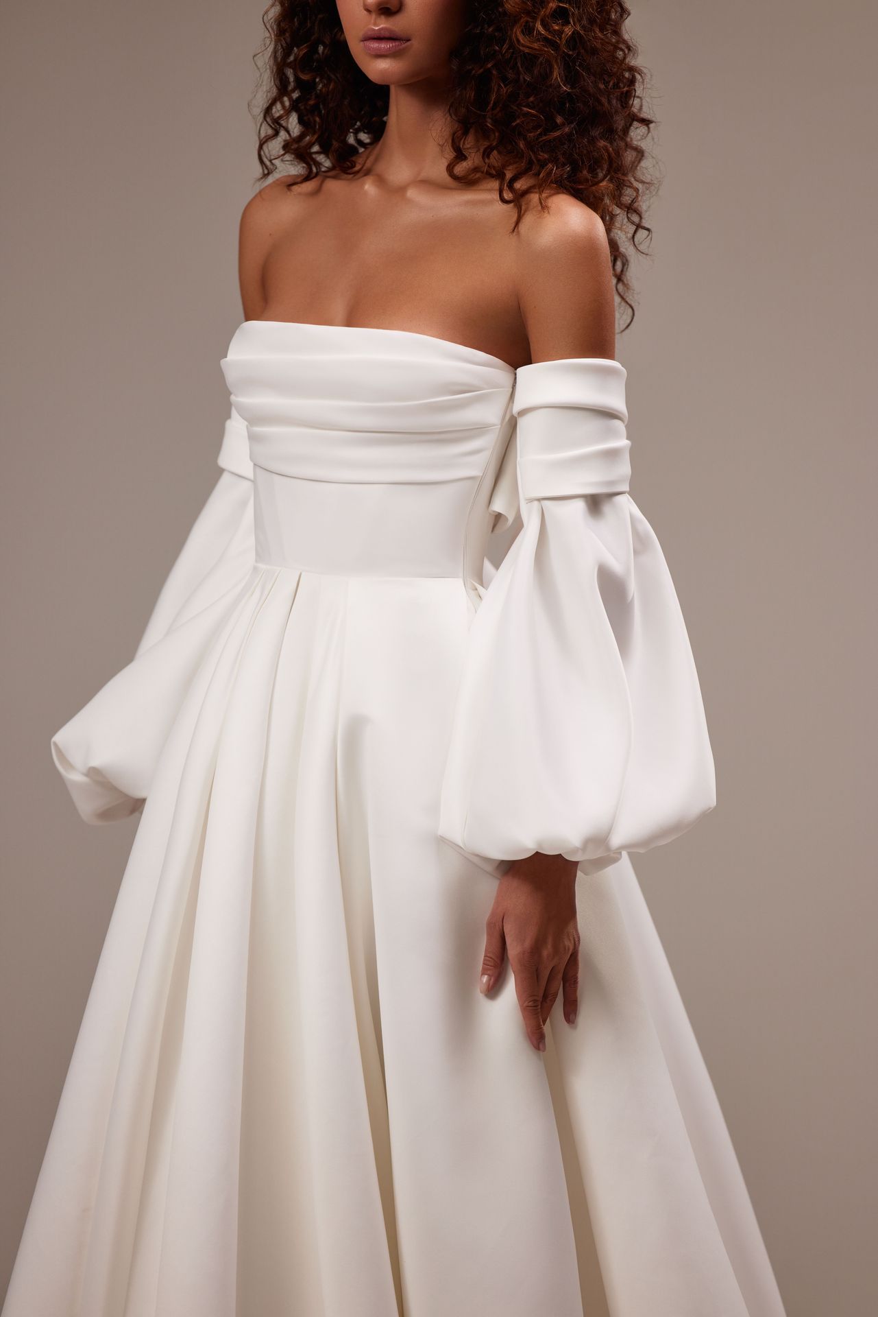 Graceful strapless A-line bridal gown showcases a straight draped neckline and an alluring open back adorned with a voluminous bow. Made from satin, the floor-length gown features a maxi train and can be complemented by detachable puffy sleeves.