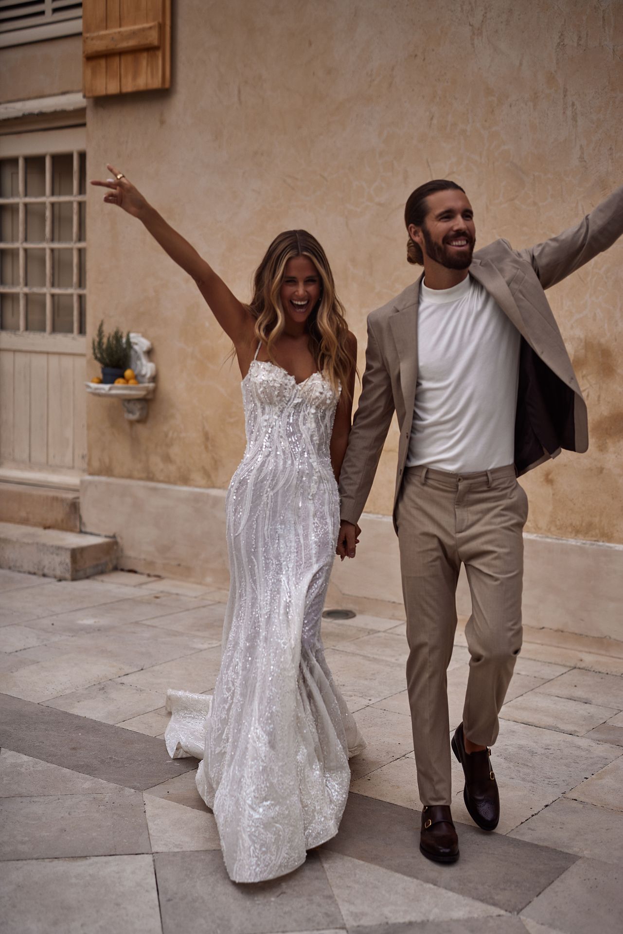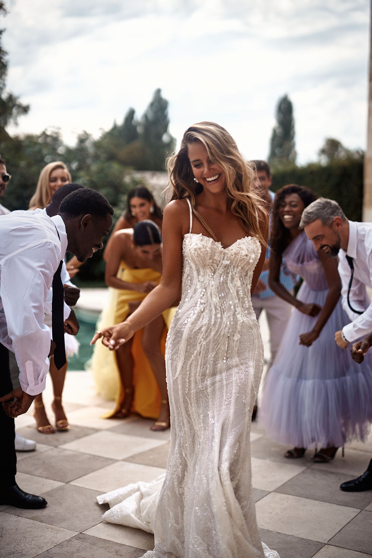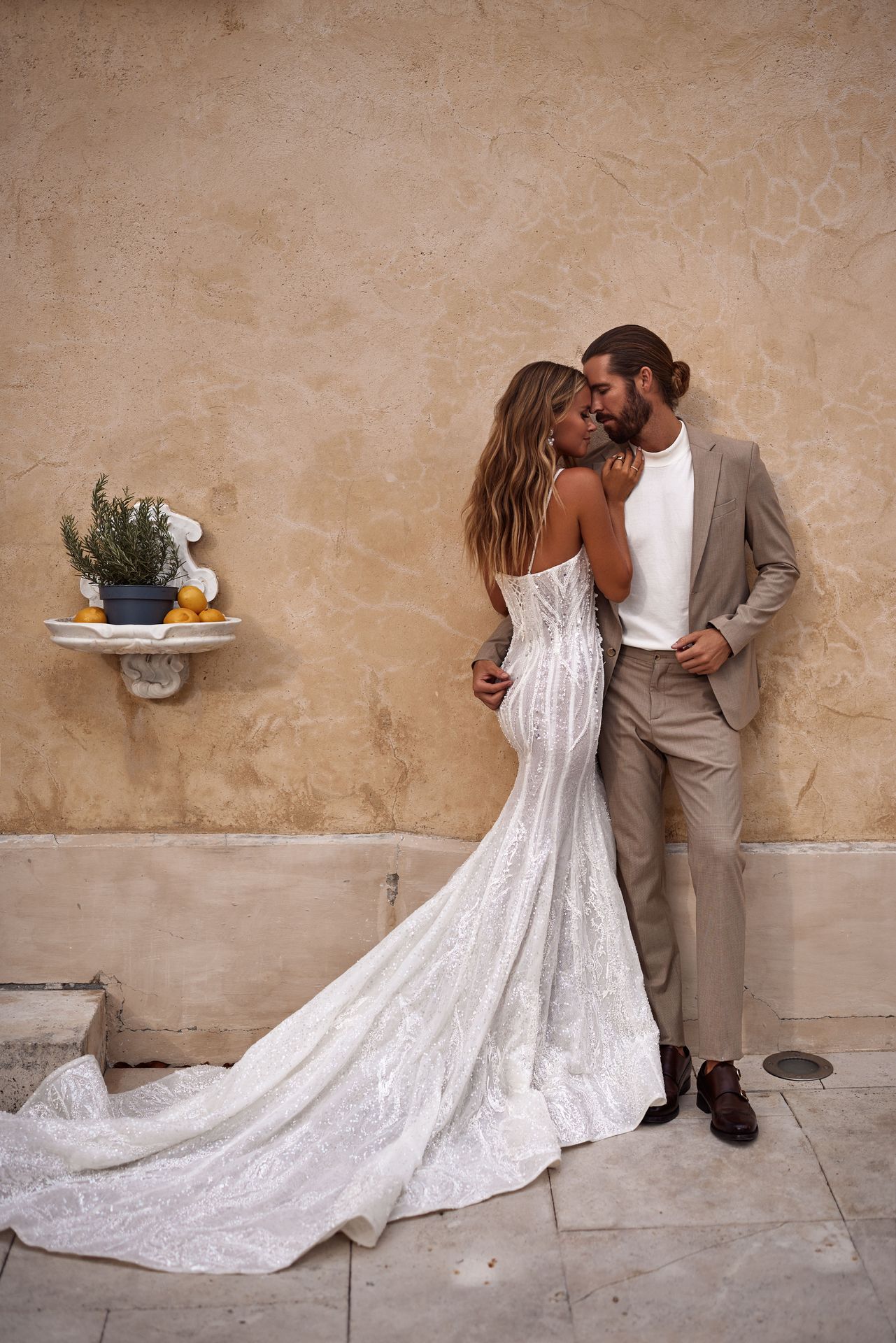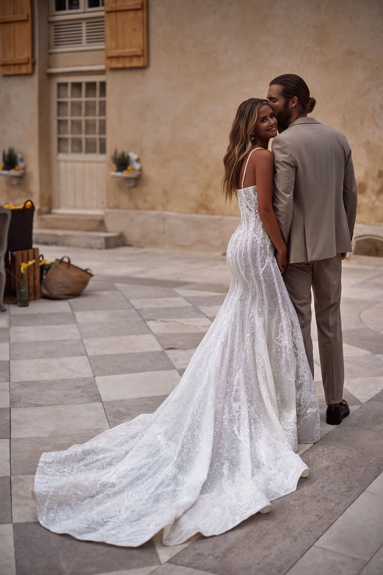 Extravagant mermaid wedding gown in lace fully embellished with sequins. Featuring a semi-transparent corset bodice with a zip closure on the back, rhinestone textured ornaments, and a floor-sweeping skirt with a long train.