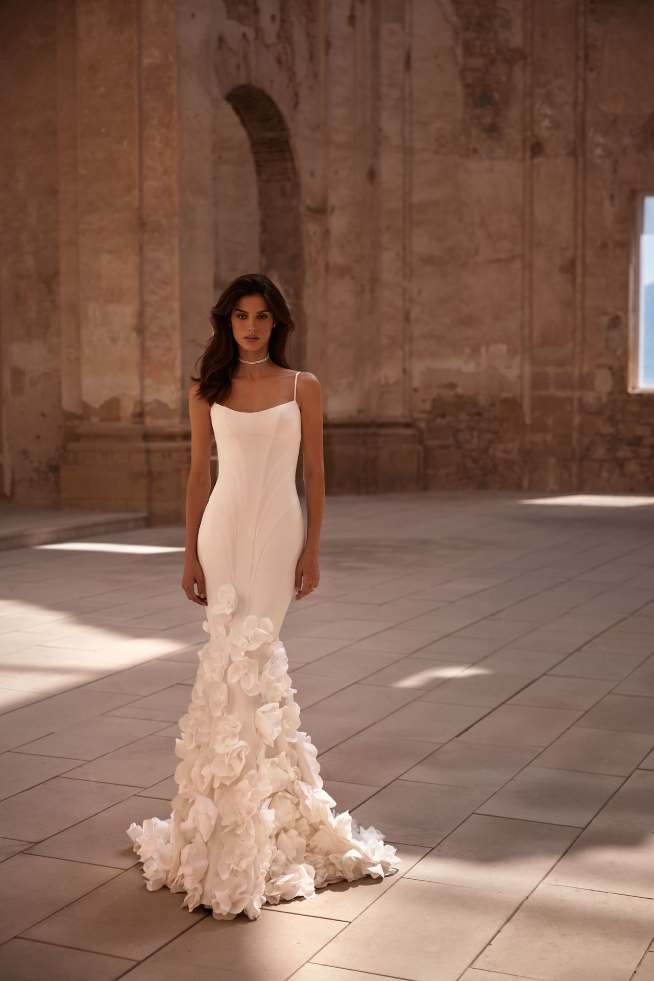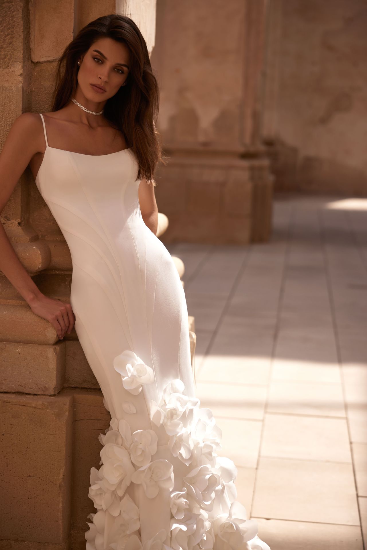 Out-of-the-ordinary mermaid gown made from lux Italian gabardine with sensational 3D rose appliques on the skirt. Featuring a straight neckline on spaghetti straps, a structured bodice, a zip closure on the closed back, and a marvelous skirt decorated with handmade flower appliques. Comes with a second-skin-shaping underwear dress.