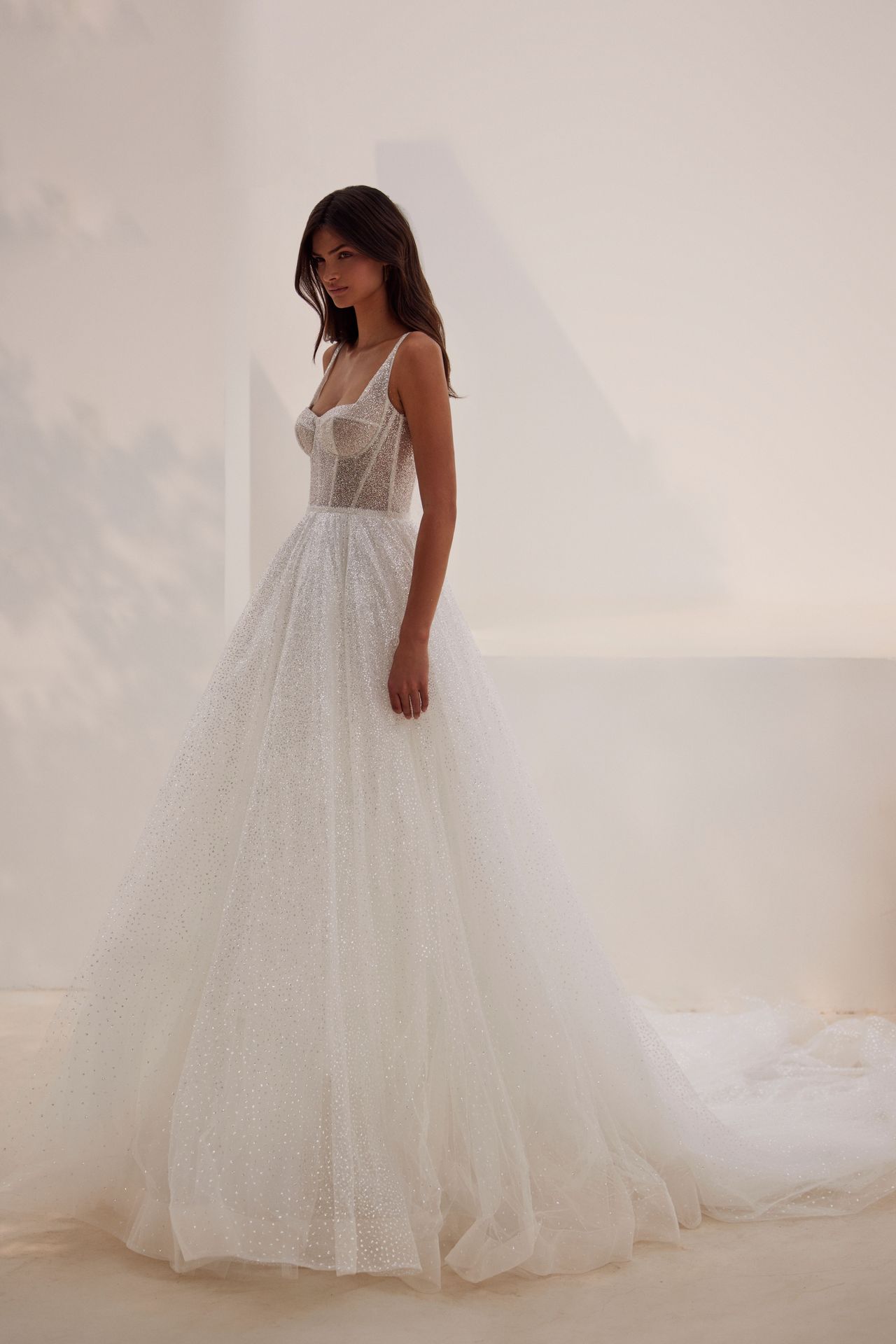 Lavish strapped wedding gown in A-line silhouette fully adorned and covered in glitter. The boned corset has a delicate heart-shaped neckline and a lace-up or zipline closure on the back. The princess style is finished with a maxi tulle shiny skirt with a long train.