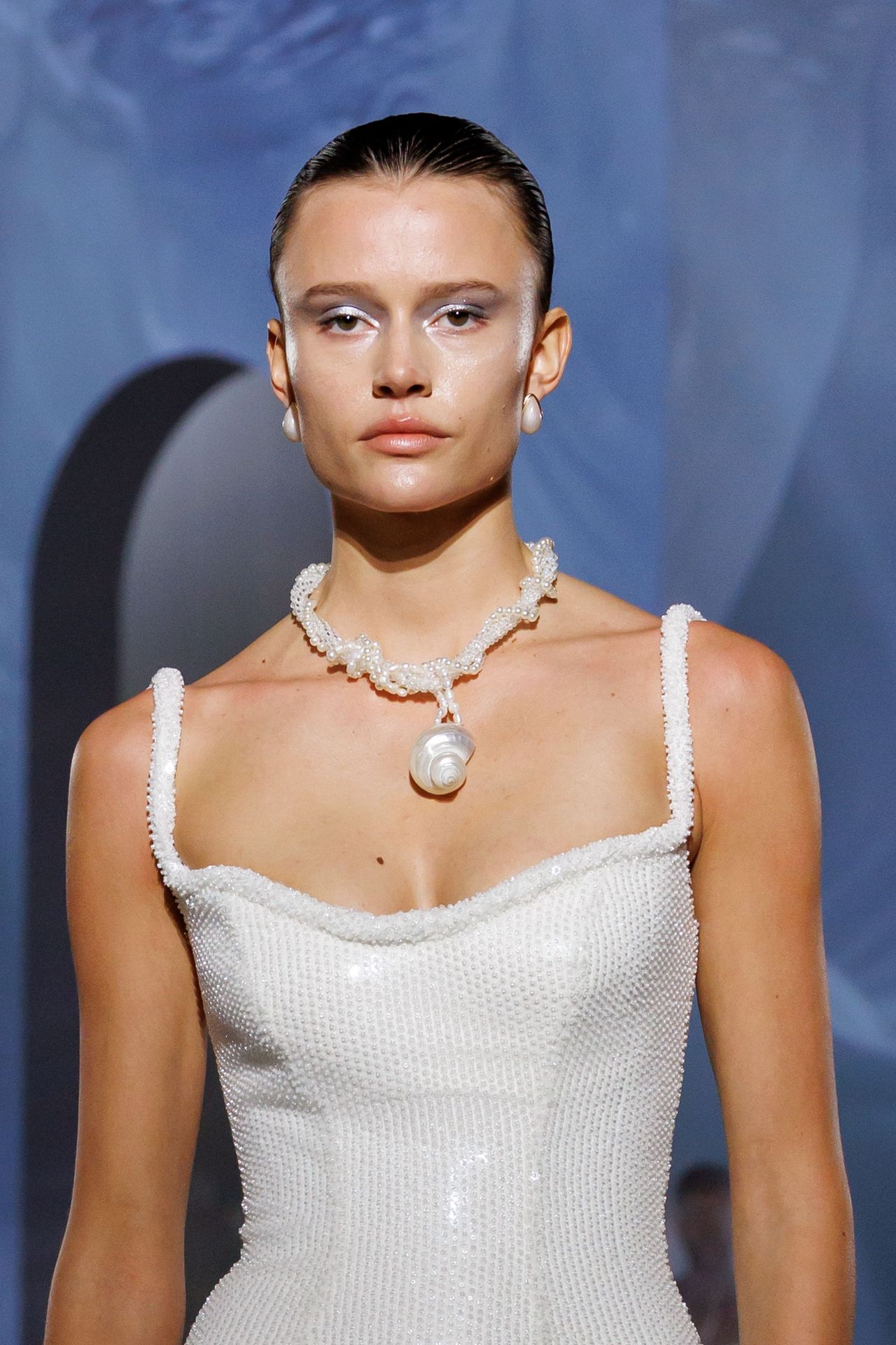 Striking mermaid wedding gown crafted from fully sequined lace and designed to evoke the shimmering effect of a mermaid’s tail. The bodice is adorned with a decorative, embellished cord framed by sequined straps, creating a sculpted, flattering silhouette supported by a sleek zip closure at the back. The fitted maxi skirt unfolds into a breathtaking ombre at the hem, where cascading lace fringe transitions seamlessly from radiant white to blush pink for glamorous movement with every step. This design is also available in a pristine all-white version for a more classical yet offbeat look.