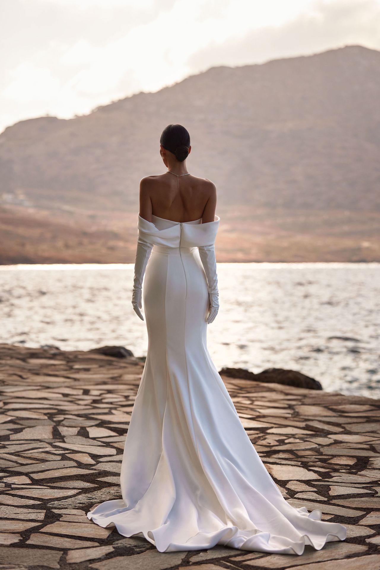 Elegant off-shoulder mermaid wedding gown with draped off-the-shoulder sleeves. The gown boasts a fitted heart-shaped bodice with visible boning for a structured yet feminine silhouette. The sleek column skirt is enhanced with delicate draping that emphasizes the curves, flowing gracefully into a midi train. Pairs perfectly with Aveline gloves.