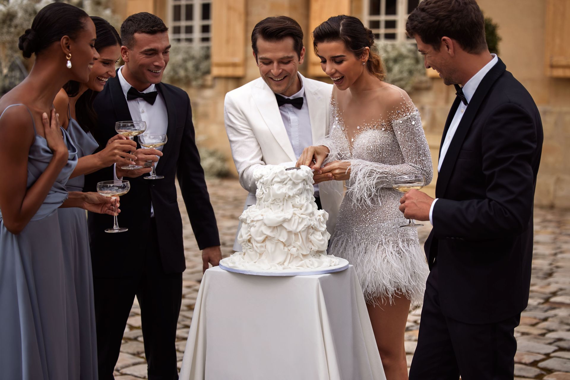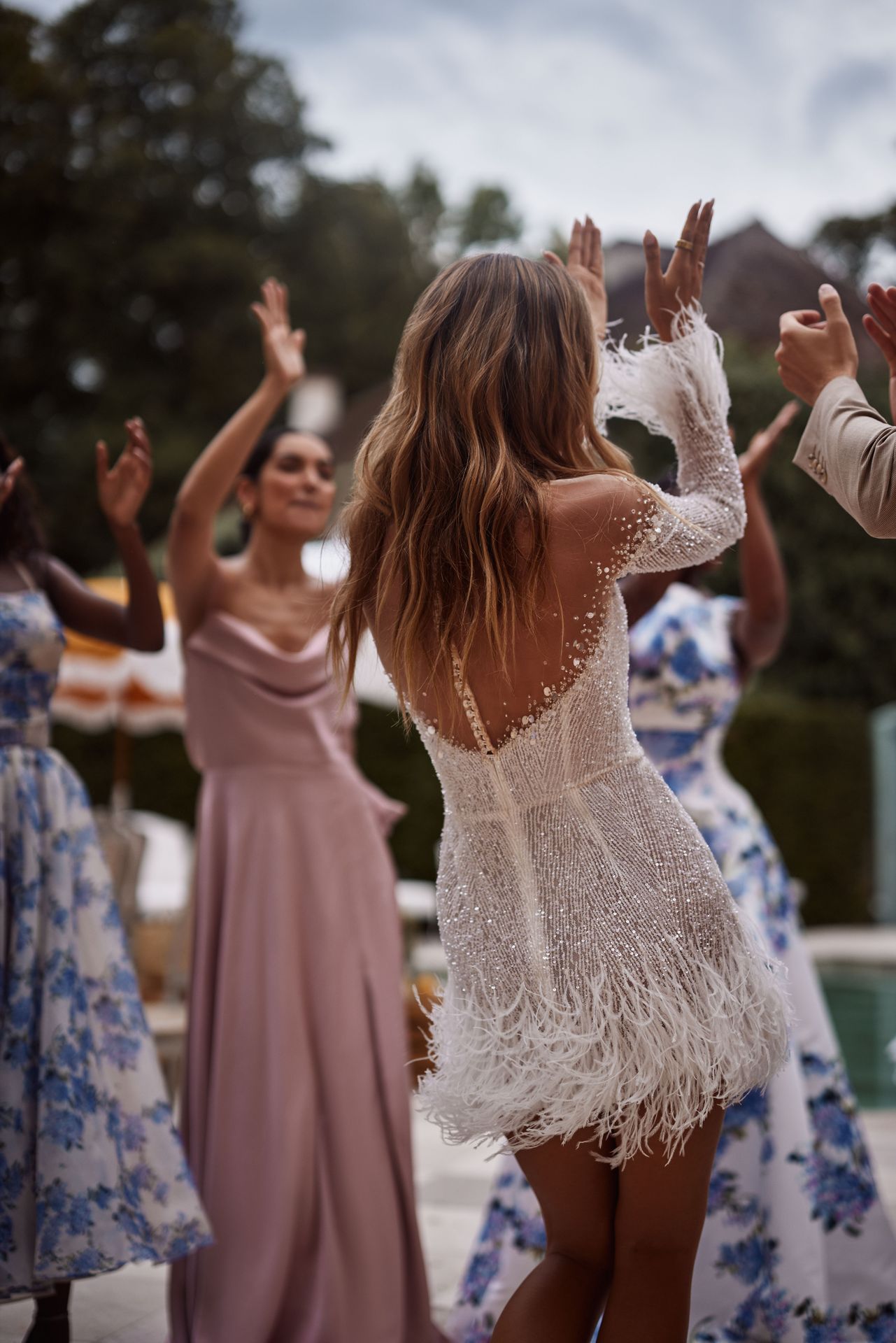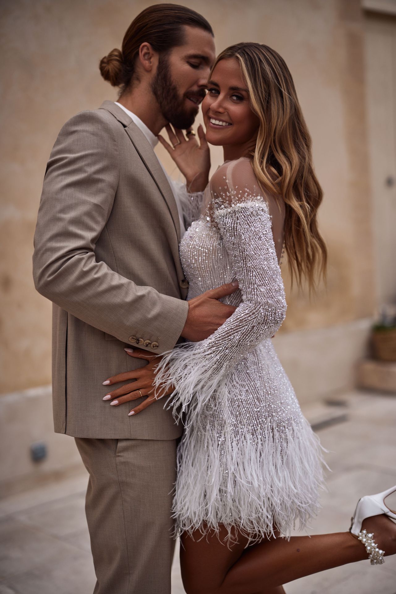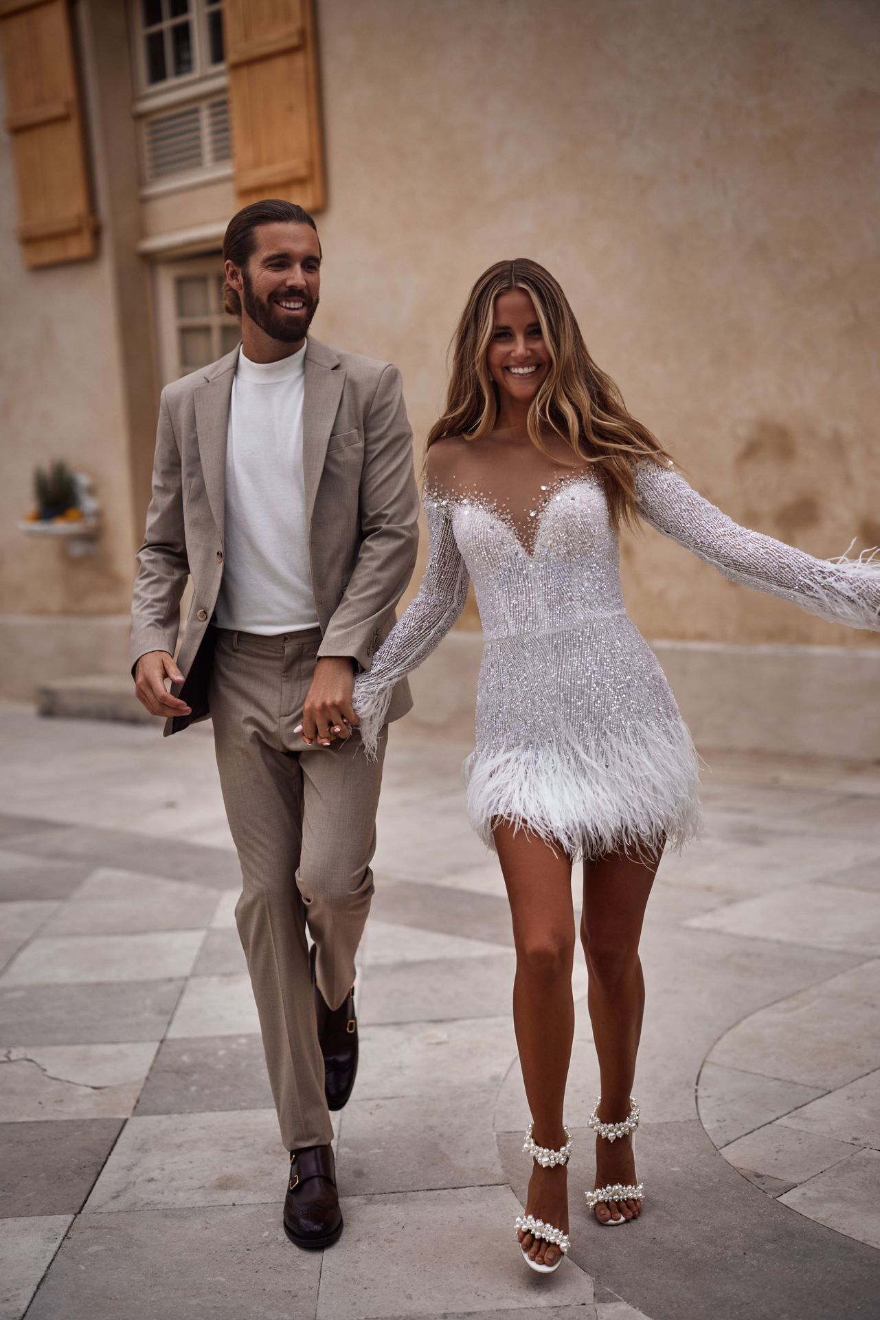 Fashionista mini wedding dress adorned with crystals and feathers. Featuring crystal-embellished lace fitted silhouette, a heart-shaped neckline with a sheer effect on the shoulders that gently flows into embellished long sleeves, adorned with feathers jazzy mini skirt, and an open buttoned back.