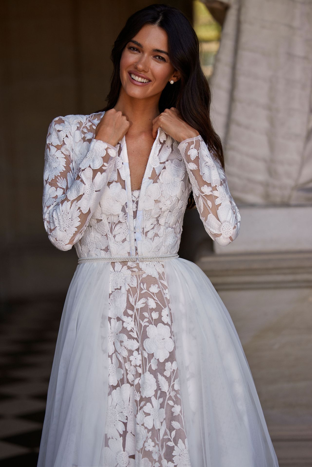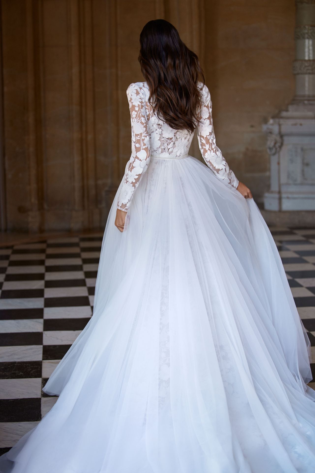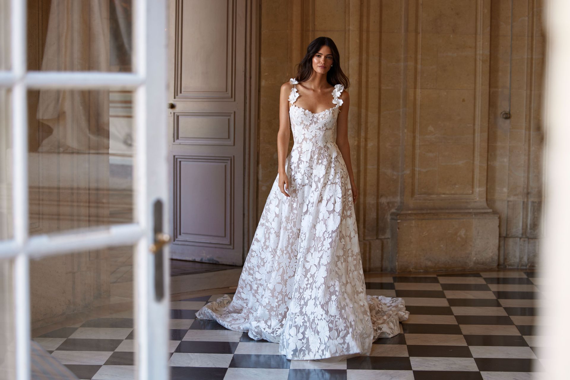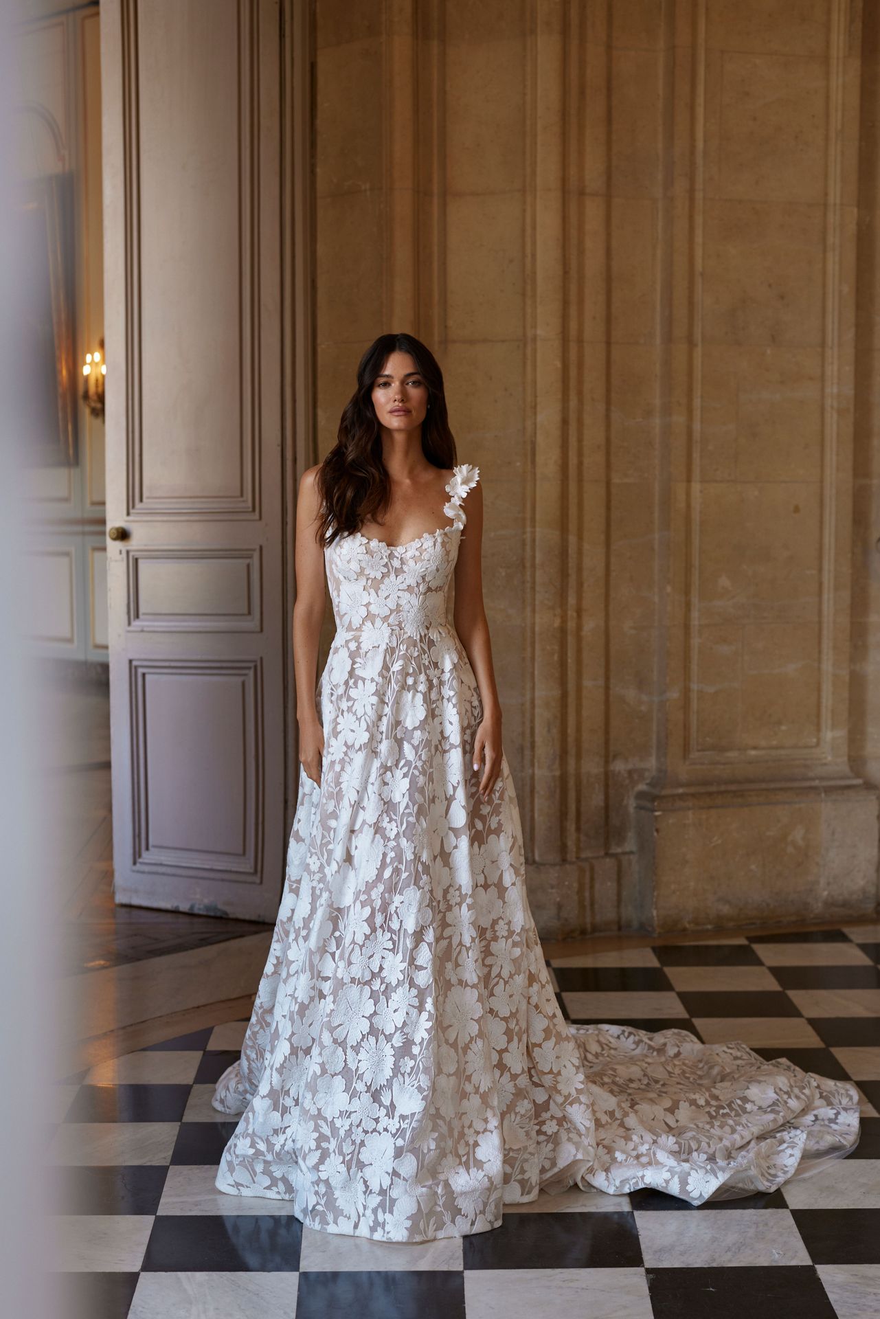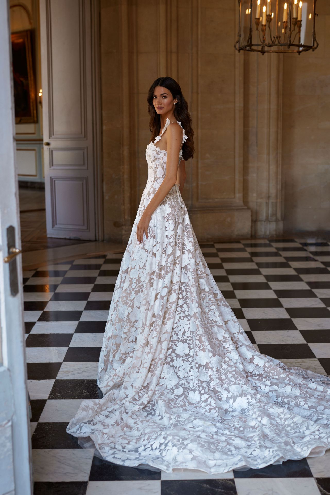 Charming A-line semi-transparent wedding gown with floral lace applique along the entire length of the gown, nude lining, 3D flowers on the straps, a sweetheart neckline, and a lace-up closure on the back. Available for order in two colors: nude and ivory.