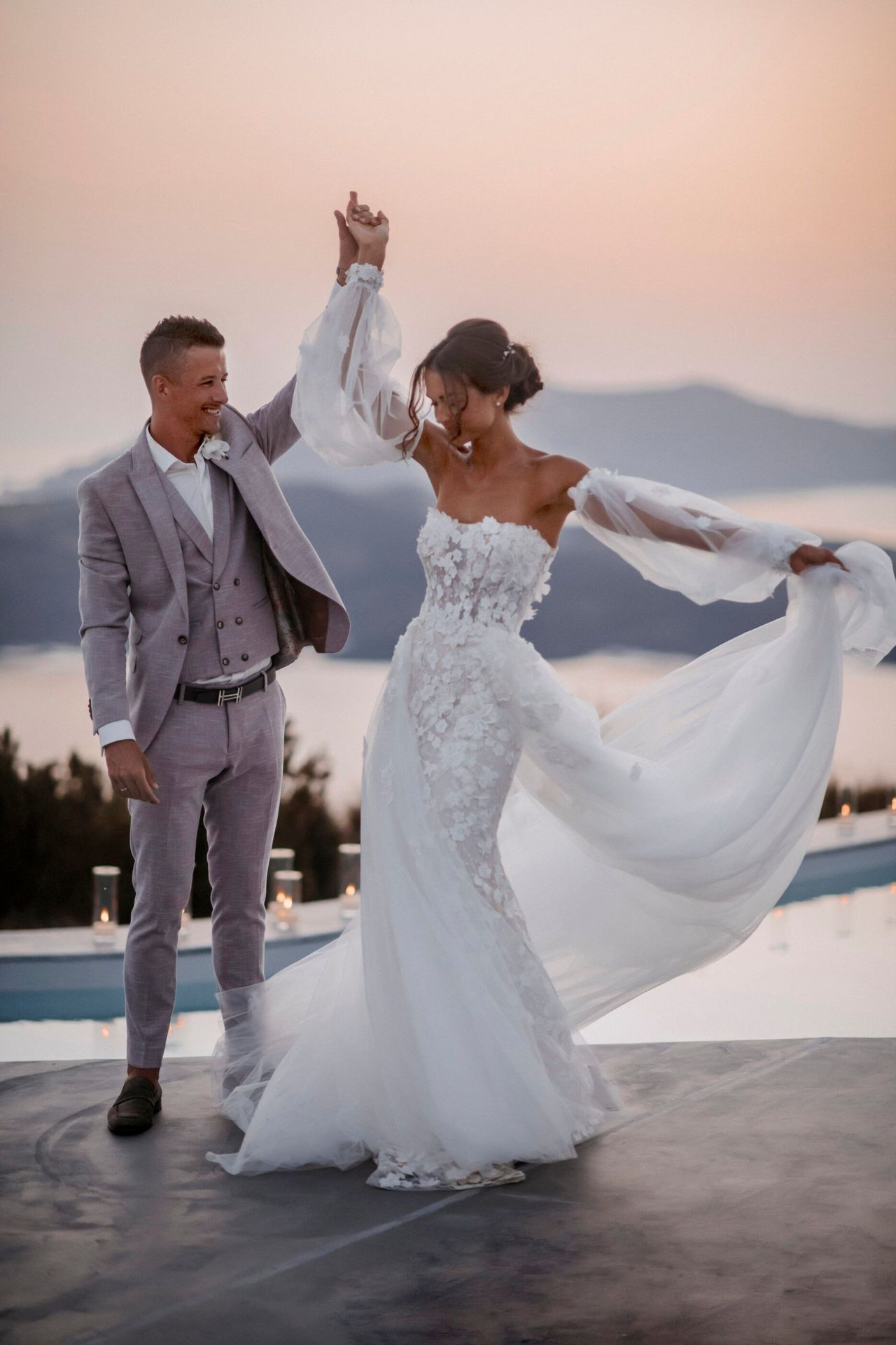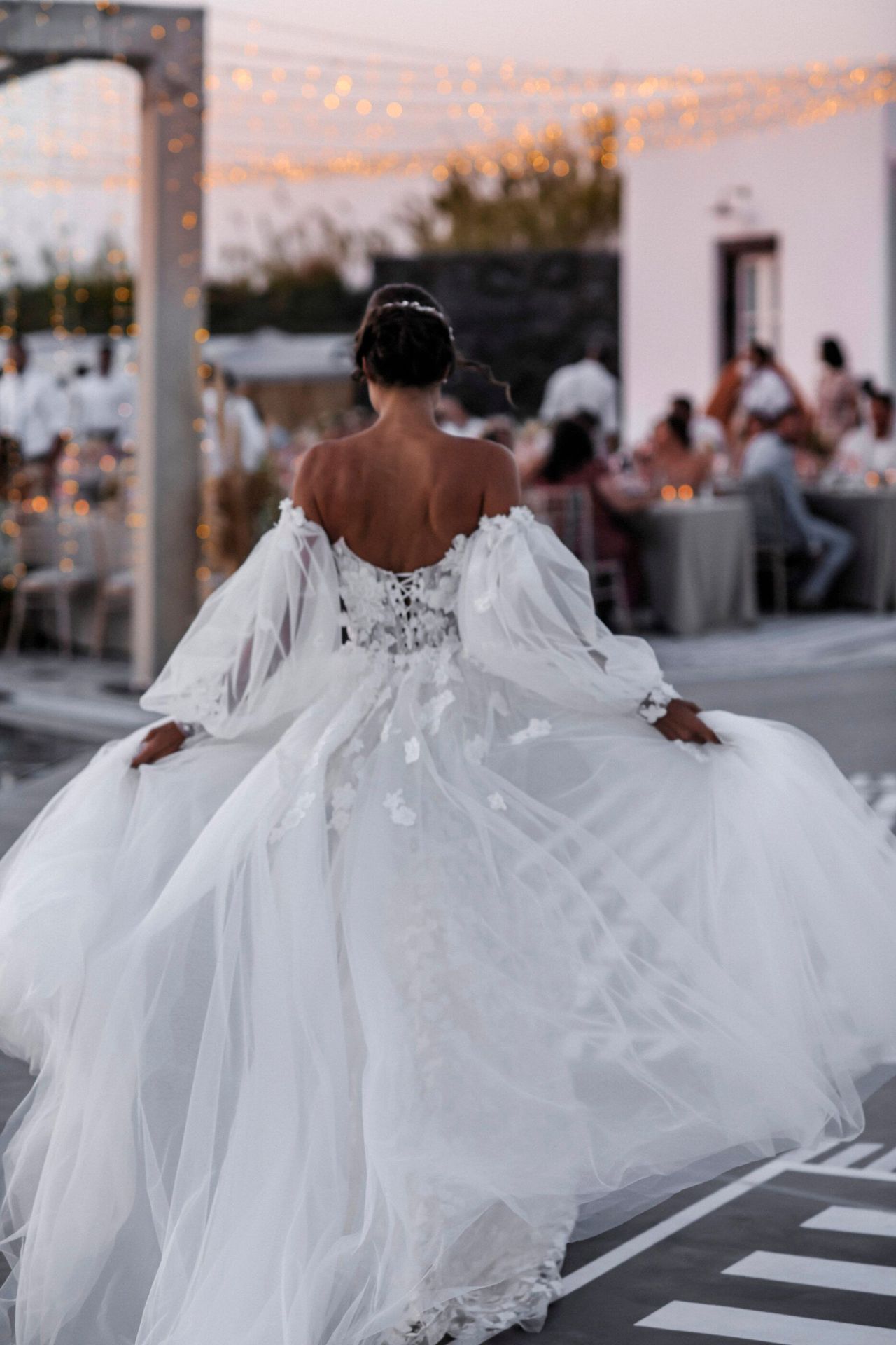 Tender fully lace-adorned sheath wedding dress. Features an off-the-shoulder bodice, sheer tulle puffy sleeves, and detachable embroidered skirt with beige lining. Complete your wedding look with a detachable semi-transparent tulle overlay skirt.