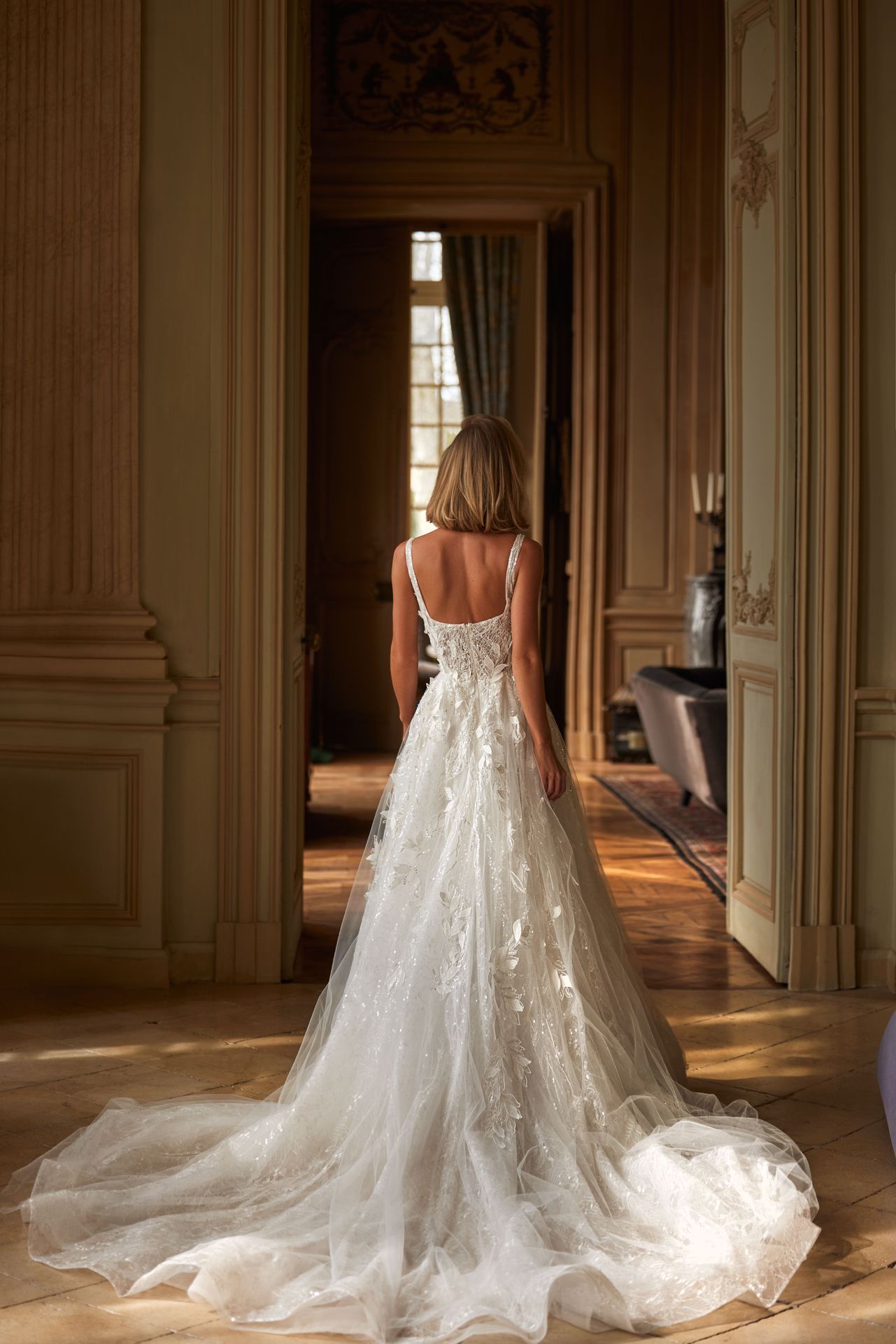 Ornate A-line wedding gown on straps. The design is fashioned from chantilly lace with a tulle overlay and adorned by hand with floral appliques and a sequin pattern. Featuring a square neckline corset on wide straps and a full skirt that gracefully extends into a long train, adding a touch of allure.