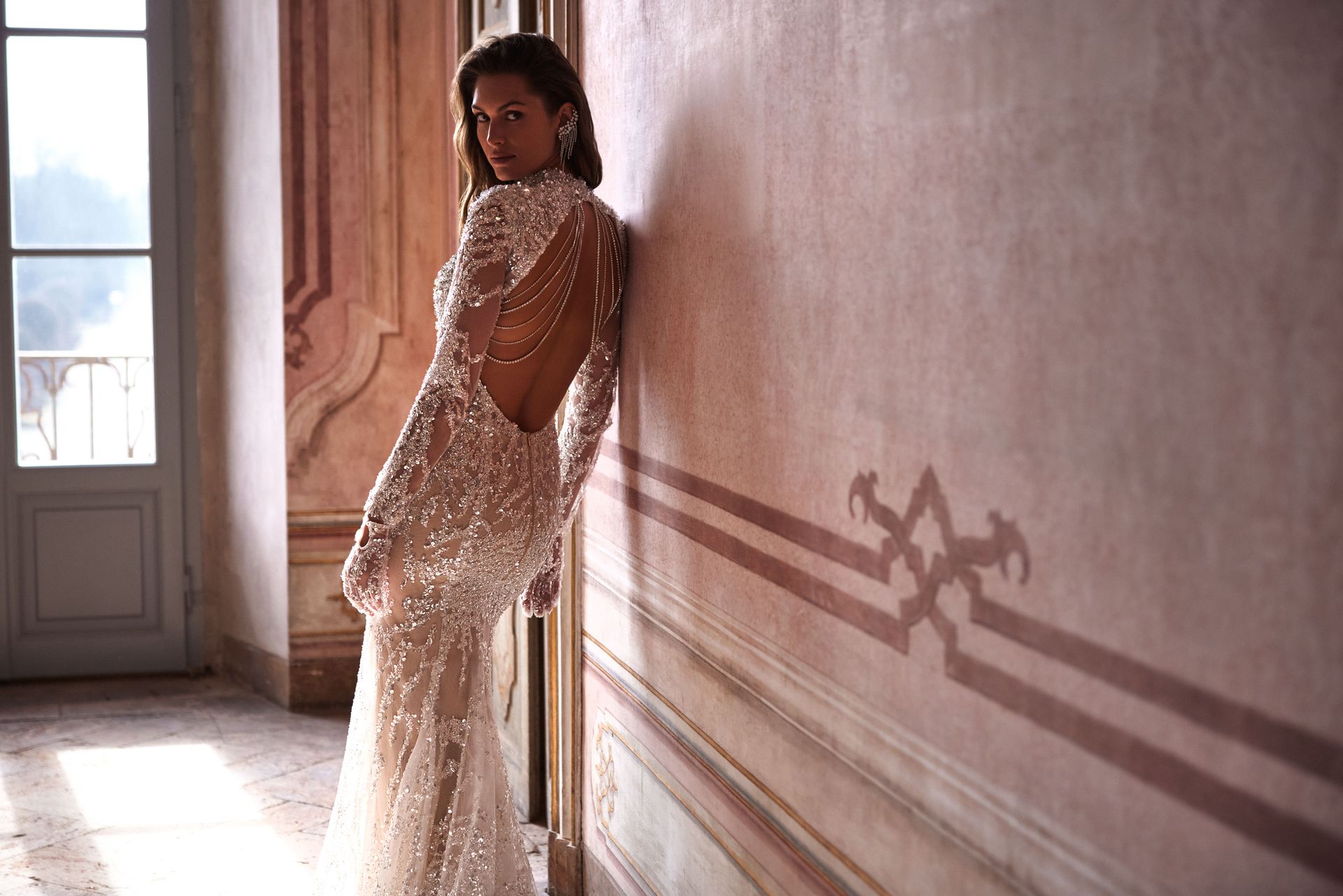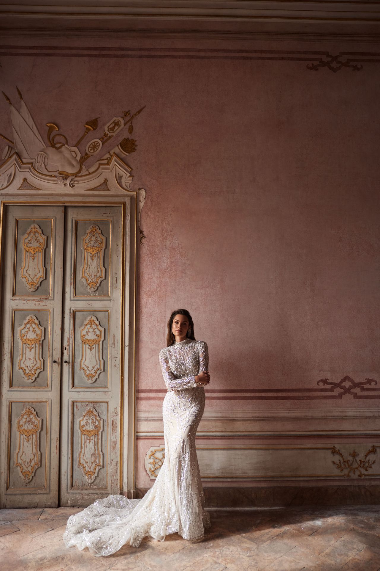 Fabulous long-sleeved mermaid gown with a fitted silhouette fully covered in sequined embellishment. Featuring a turtleneck, adorned sheer long sleeves, and a sequined skirt with a long train. The deep open back is decorated with crystal beaded chains.