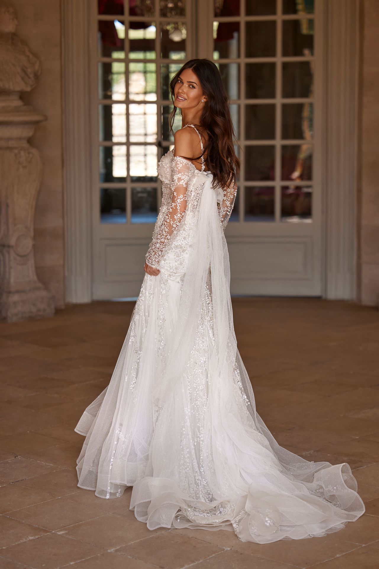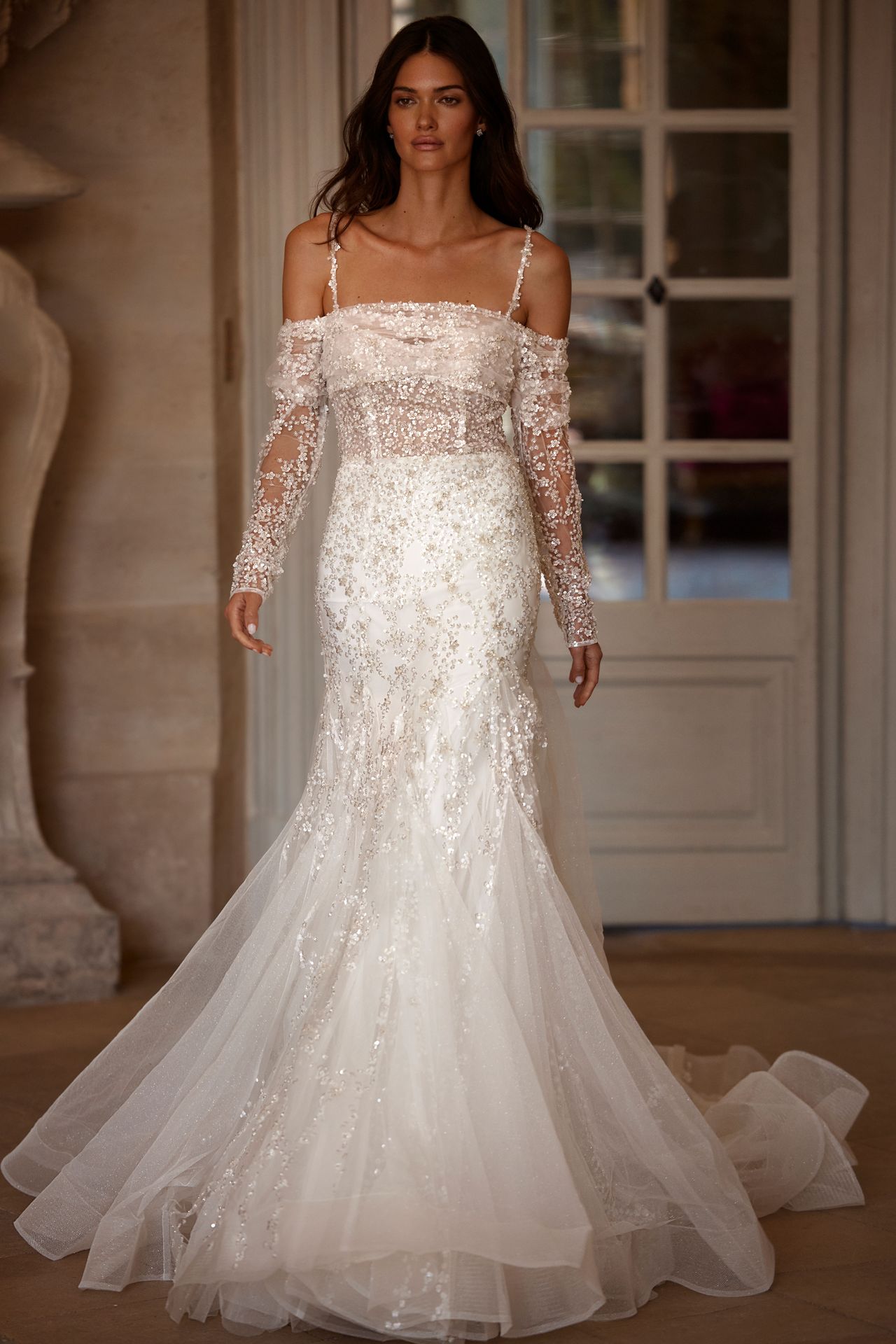 Shiny spaghetti straps fitted gown in ivory fully covered in beaded and sequined lace applique.