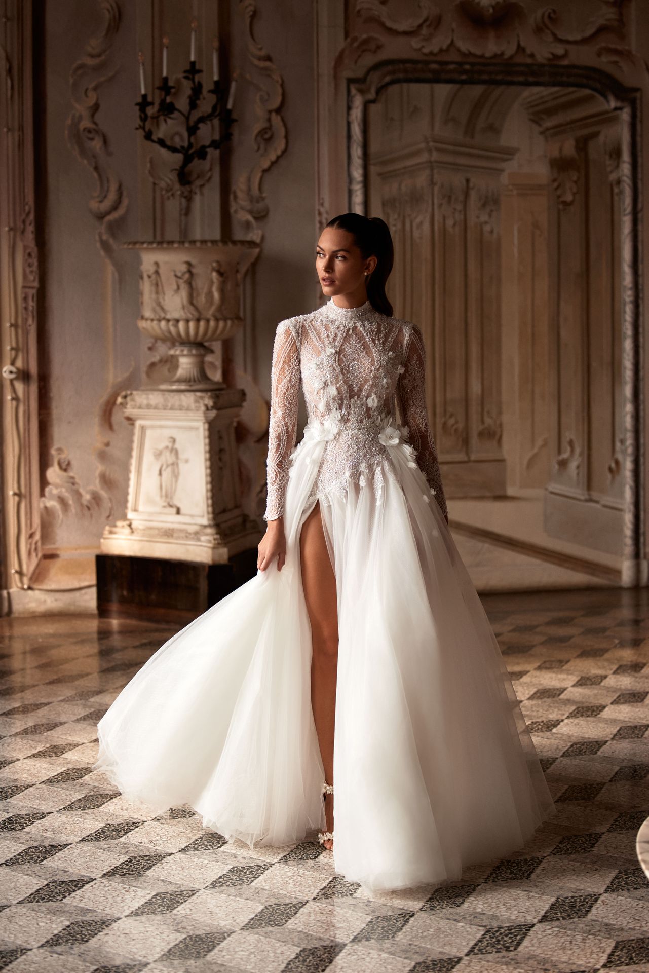 Lush long-sleeved ball gown designed in an embellished semi-transparent lace. Features a turtleneck, lace-applique top embroidered with rhinestones and 3d flowers, and a sheer skirt with a detachable tulle train.
