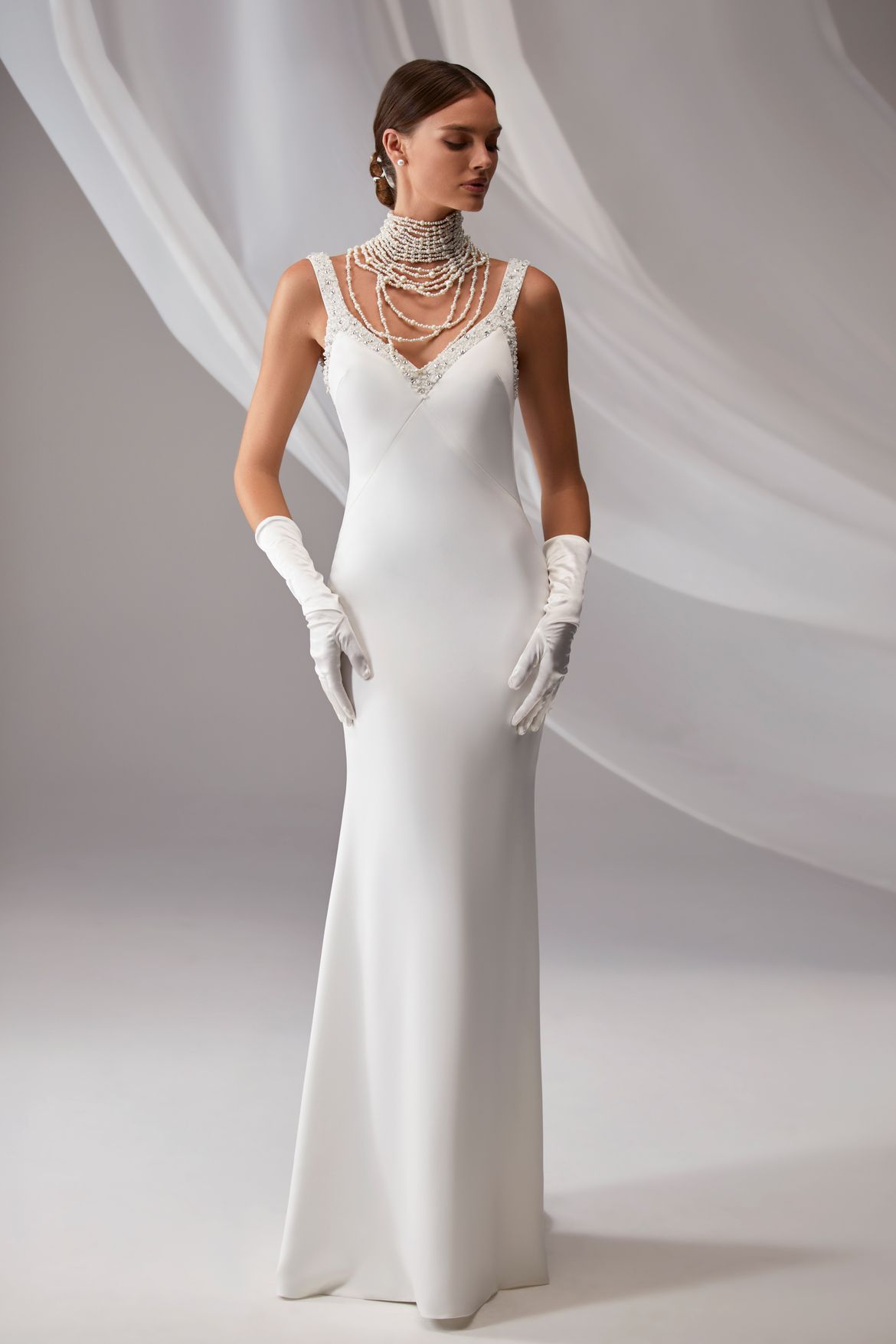 Vintage inspired wedding dress with V-neckline and beaded strapes.