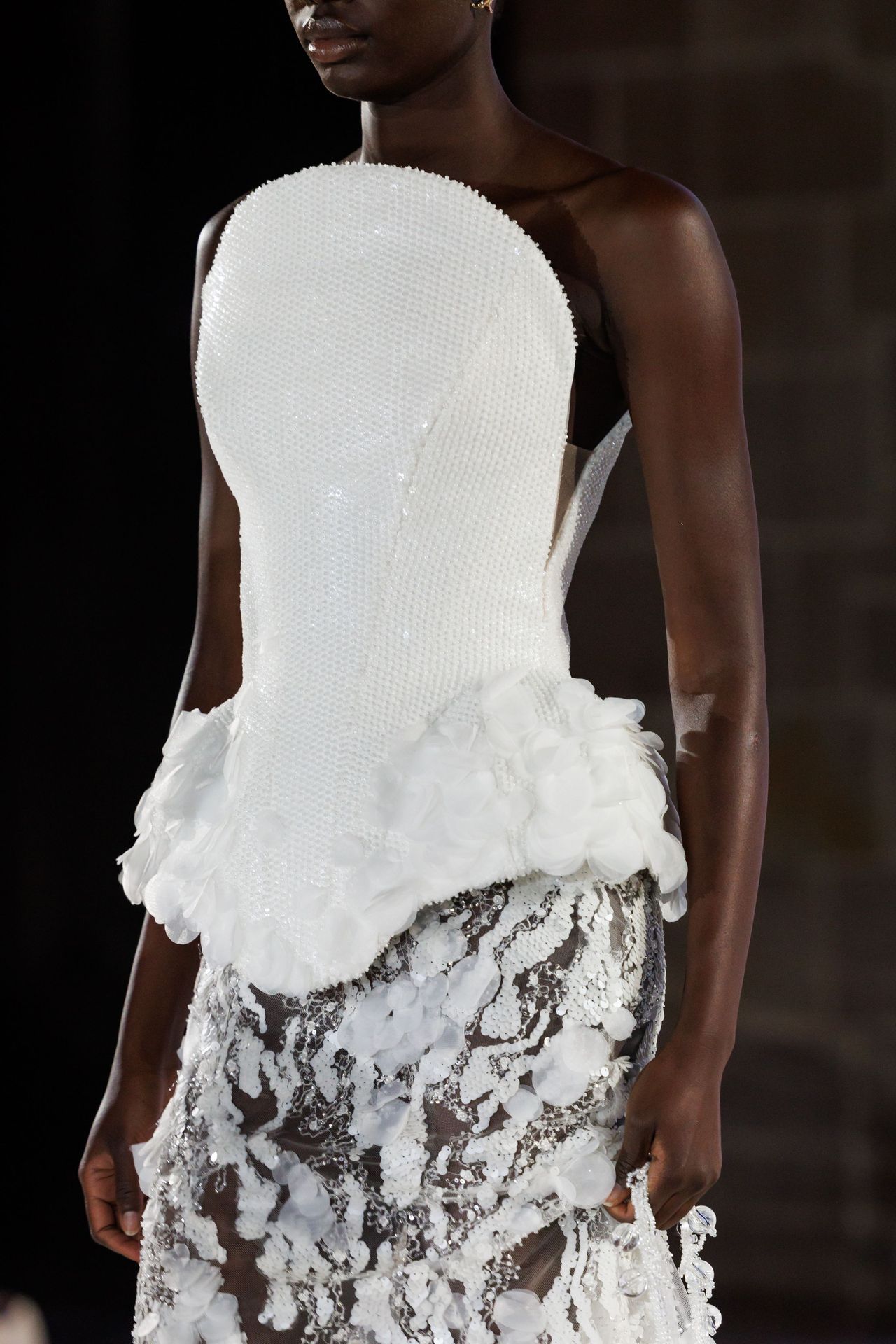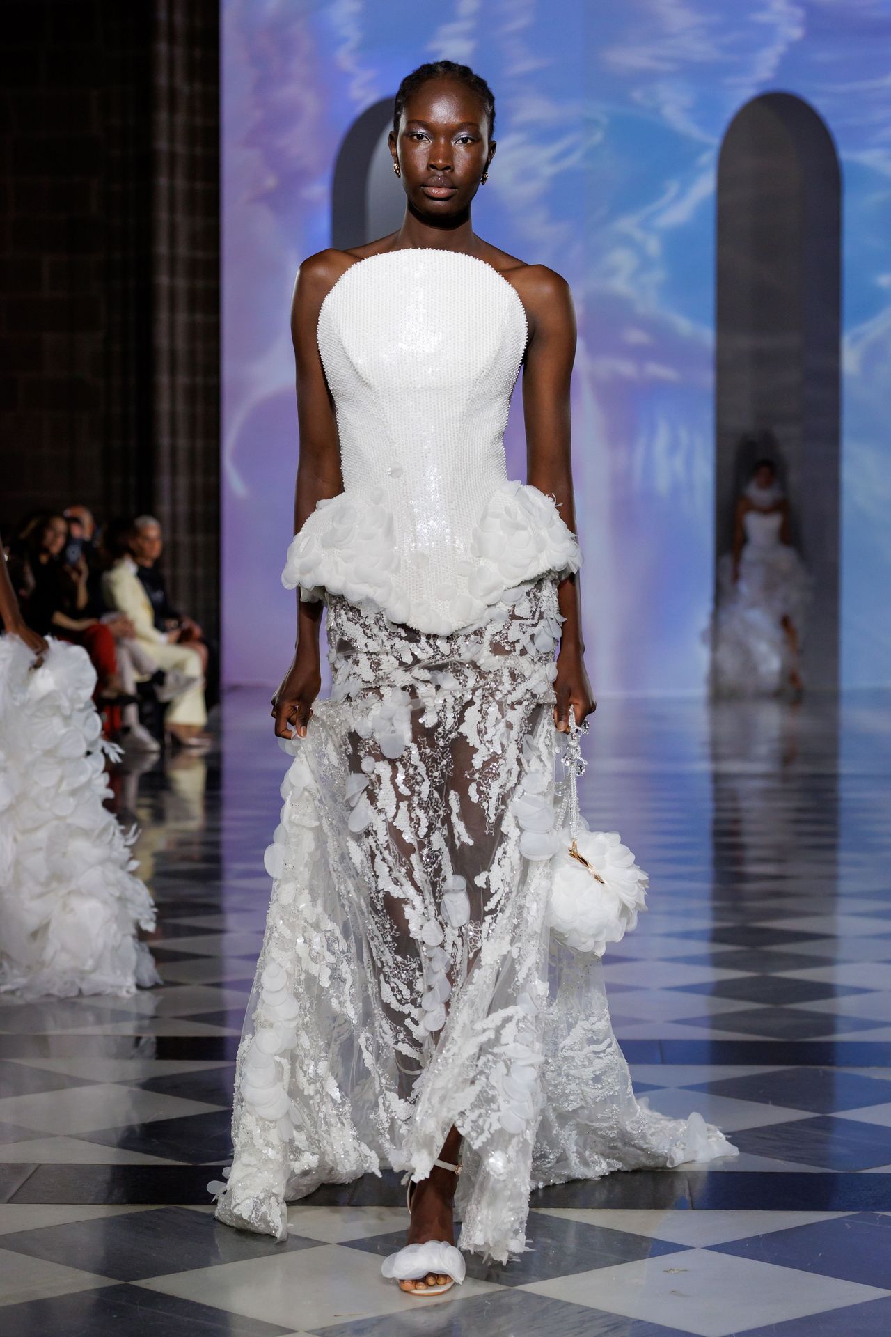 Ritzy sculpted lace corset fully embellished with sequins to resemble a mermaid scale. Featuring a half-moon neckline and a lowered design, the corset boasts exaggerated volume at the hips adorned with delicate hand-placed organza scales, creating a mesmerizing mermaid-inspired aesthetic. The corset can be paired with the mesmerizing Rhelora lace skirt with a sea foam ornament or the ethereal Rhelora organza bridal bag for a flawlessly sophisticated sea-themed ensemble.
