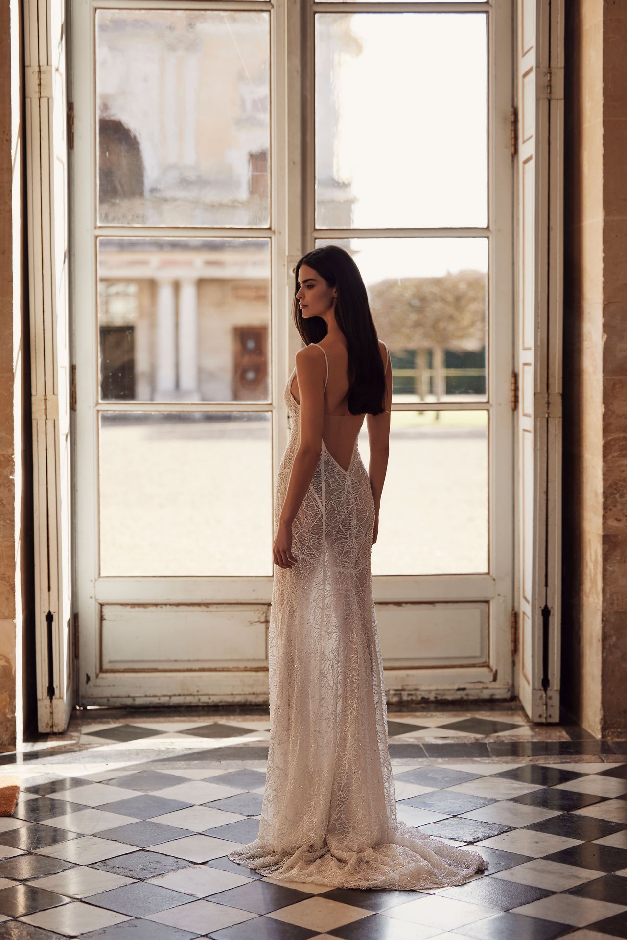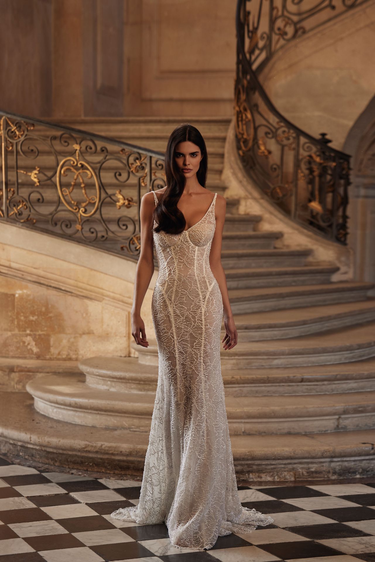 Stupendous sheath wedding gown made of lux chantilly lace embellished by hand with sequins. Featuring a V-neckline supported by delicate straps, a boned corset with structured lines alongside the gown emphasizing the curves, a fitted skirt with a modest train, and a deeply plunging illusion V-back. Comes with an underskirt. Add a Neelam dress for a more dramatic look.