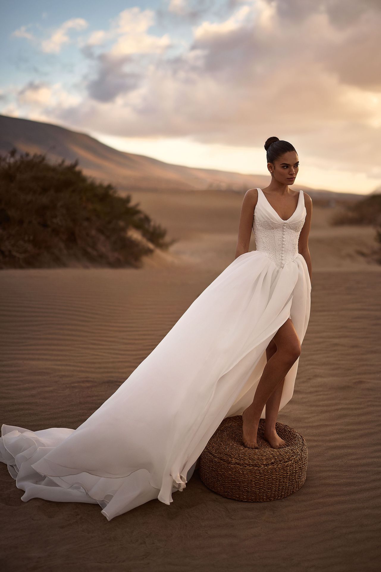 Refined A-line wedding gown imbued with vintage charm. The structured drop-waist corset is delicately adorned with intricate lace appliques and a charming row of buttons, showcasing a deep V-neckline framed by wide straps and a subtle lace-up closure at the closed back. The airy organza skirt cascades effortlessly from the waist to the midi train. You can choose the option with buttons or pearls on the corset.