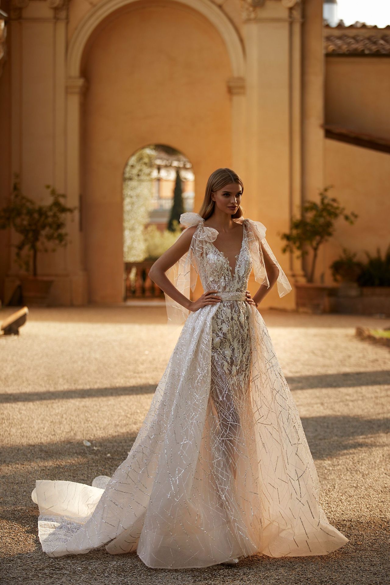 Semi-transparent beaded sheath gown with a plunging V-neckline, an open back, and tulle bow‑straps. Romelia train will perfectly complement this gown to create an even more dreamy look.