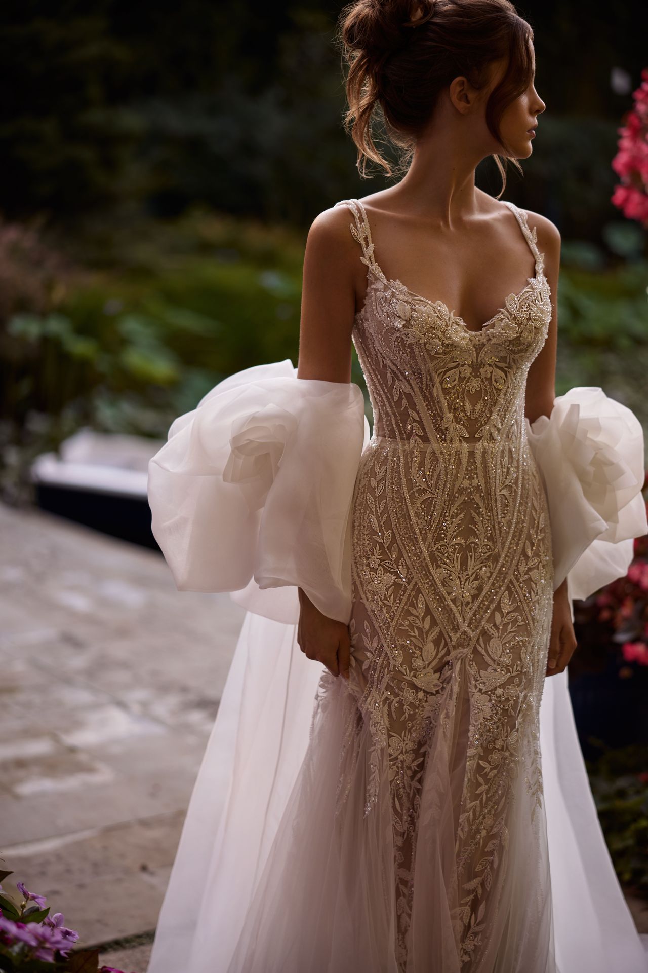 Glamorous mermaid gown made from semi-transparent lace, intricately embellished by hand with exquisite sequined and beaded ornament. Featuring an adorned heart-shaped neckline on adjustable spaghetti straps, a lace-up closure on the back, an embellished maxi skirt, including a nude underskirt and a soft tulle overlay on the train for added volume and graceful movement. Can be complemented with a Fusion cape.