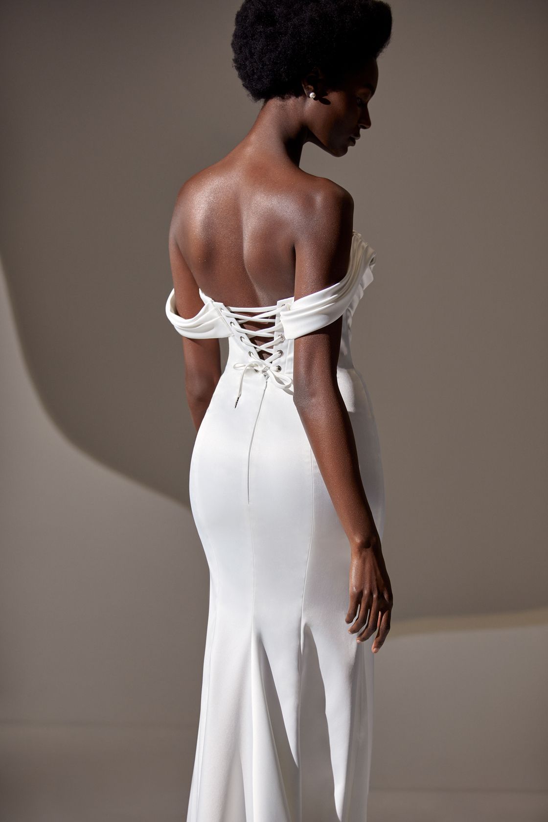 Mermaid off-the-shoulders wedding dress in satin with a drapped corset.