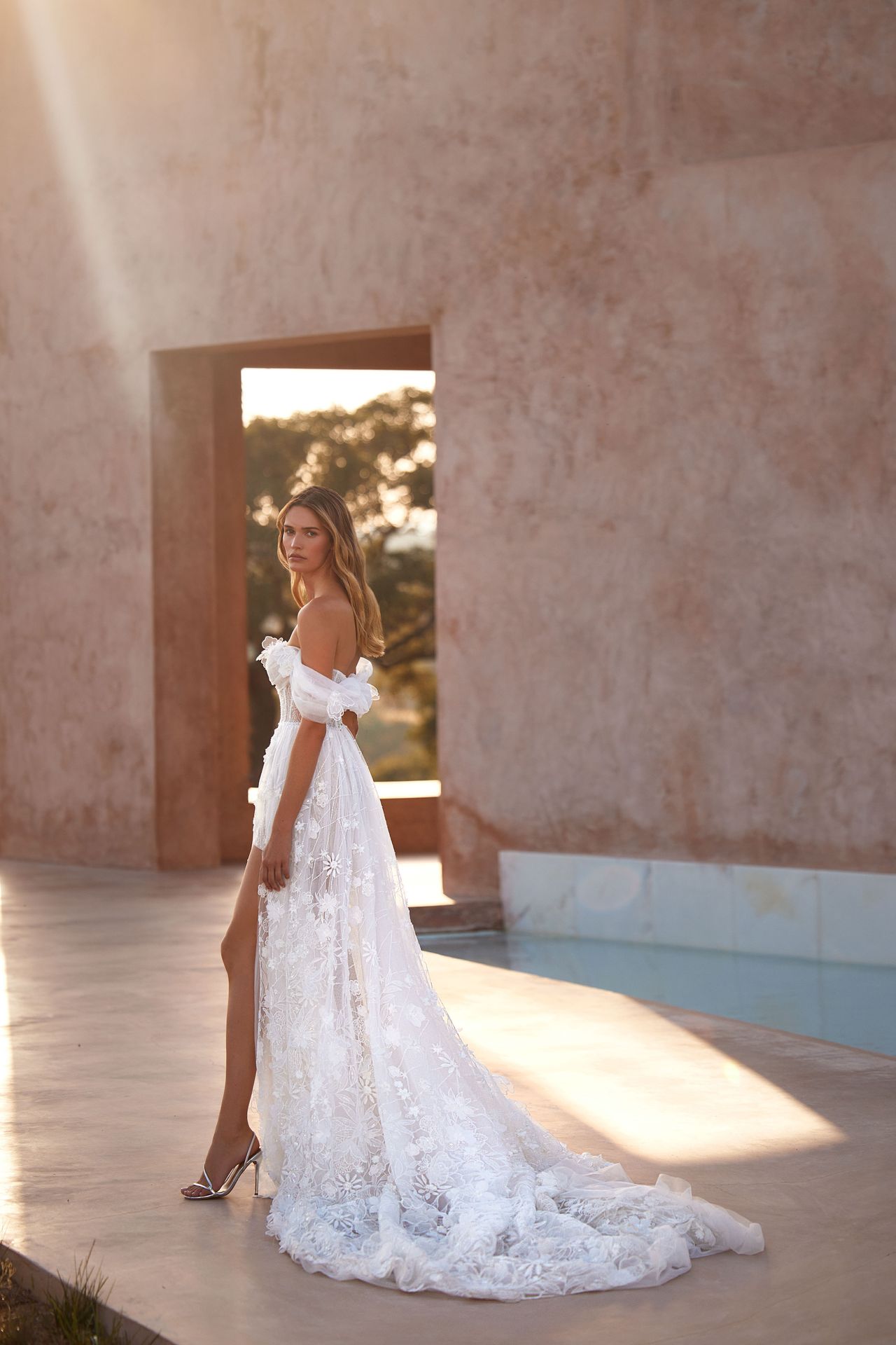 Captivating semi-transparent shiny A-line wedding gown adorned with 3D wildflower lace ornament and sequins. Featuring a heart-shaped corset with off-the-shoulder tulle sleeves embellished with 3D flowers, lace-up closure on the back, and maxi skirt with tulle floral-lace overlay.