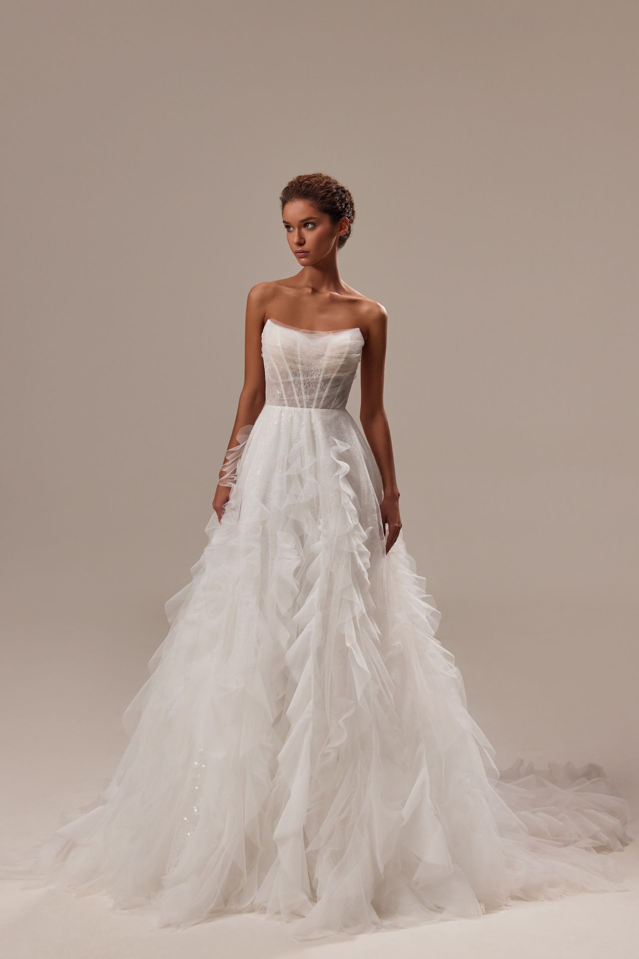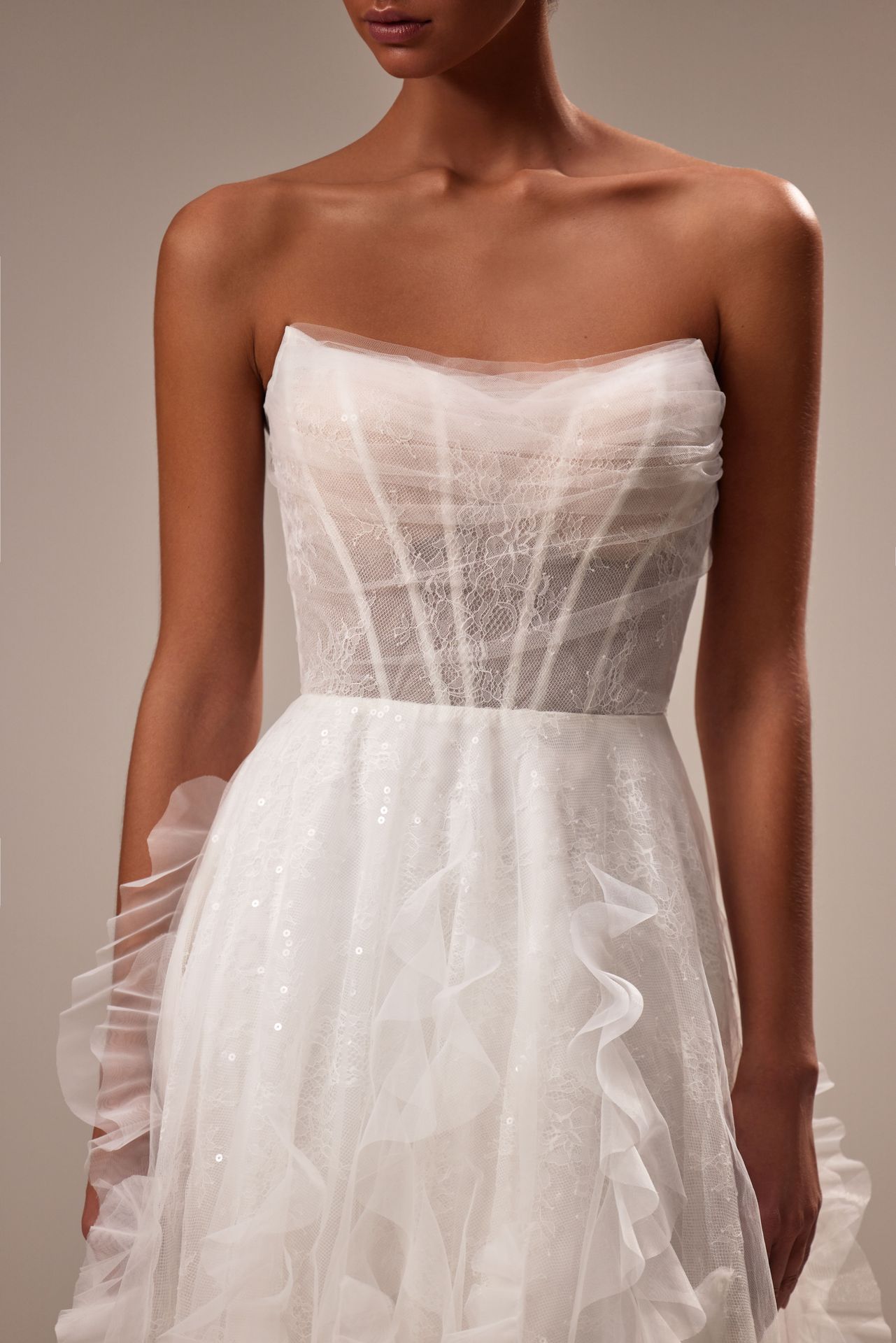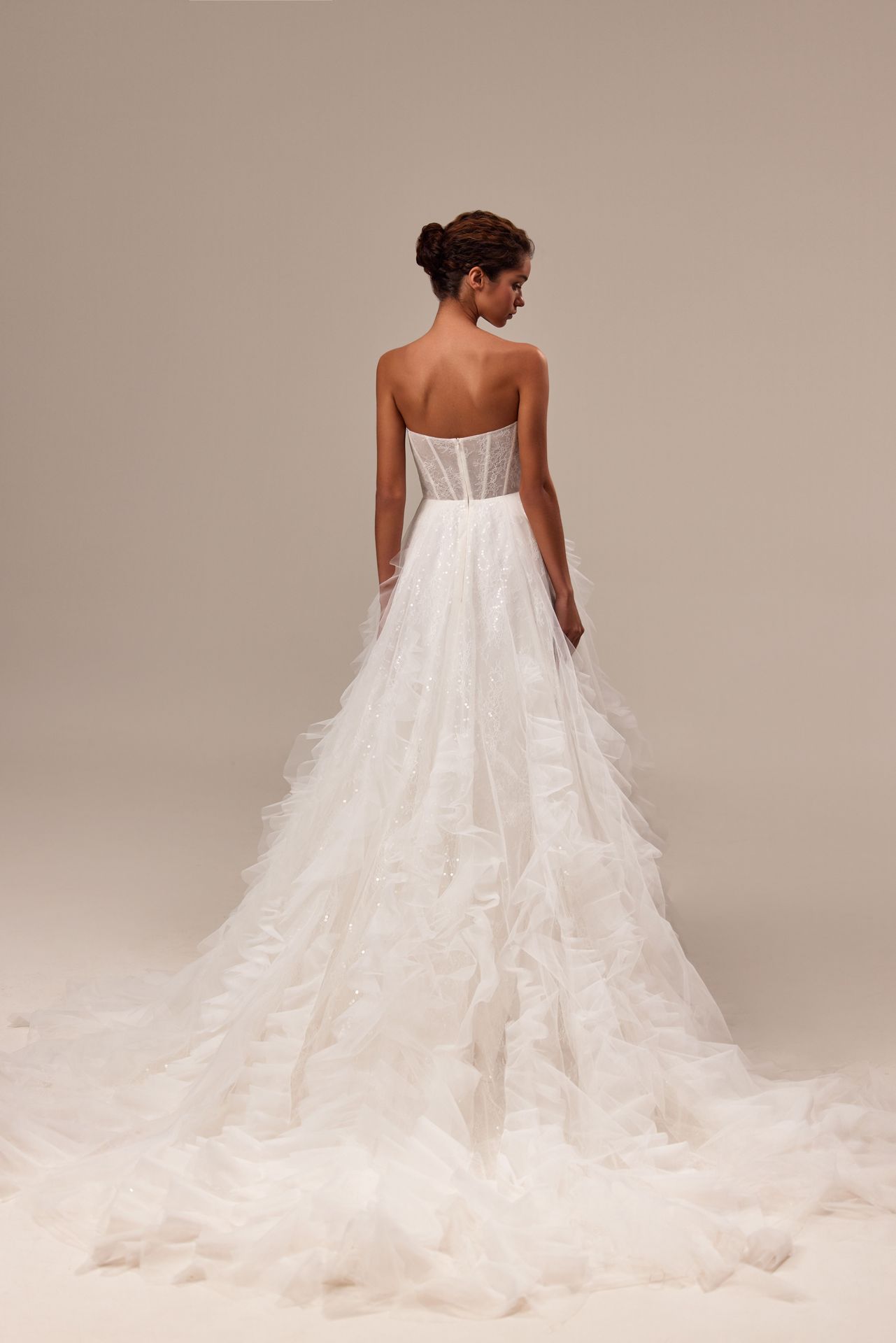 Covered in sequins fabulous wedding gown blends chantilly lace and ruffles. Featuring a strapless heart-shaped sheer boned corset coupled with a dozen meters of asymmetrically draped ruffles, cascading to a waterfall of floor-length layers of sequined tulle. Can be complimented by a long vintage-inspired Ruzhena veil embellished with sequined applique.