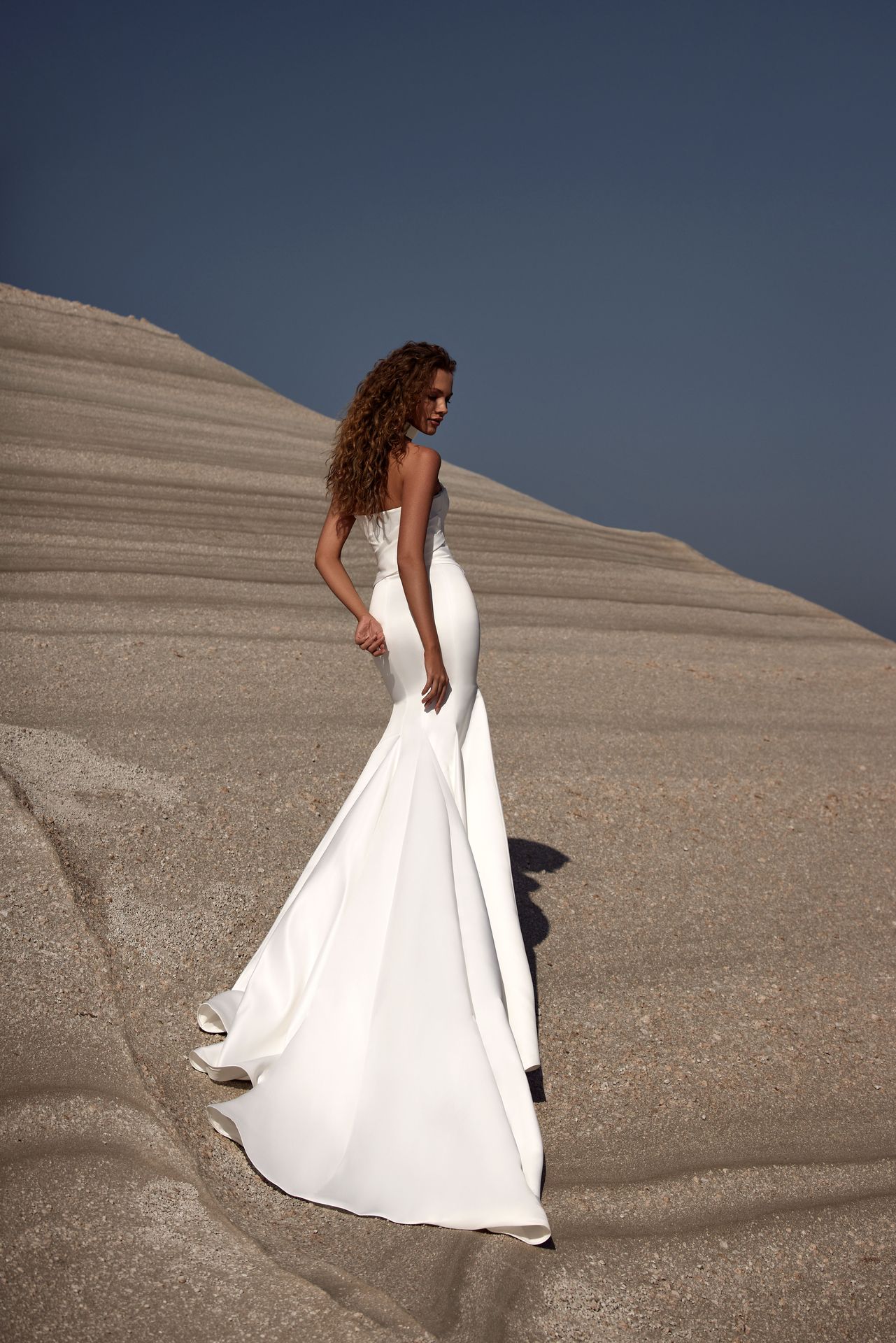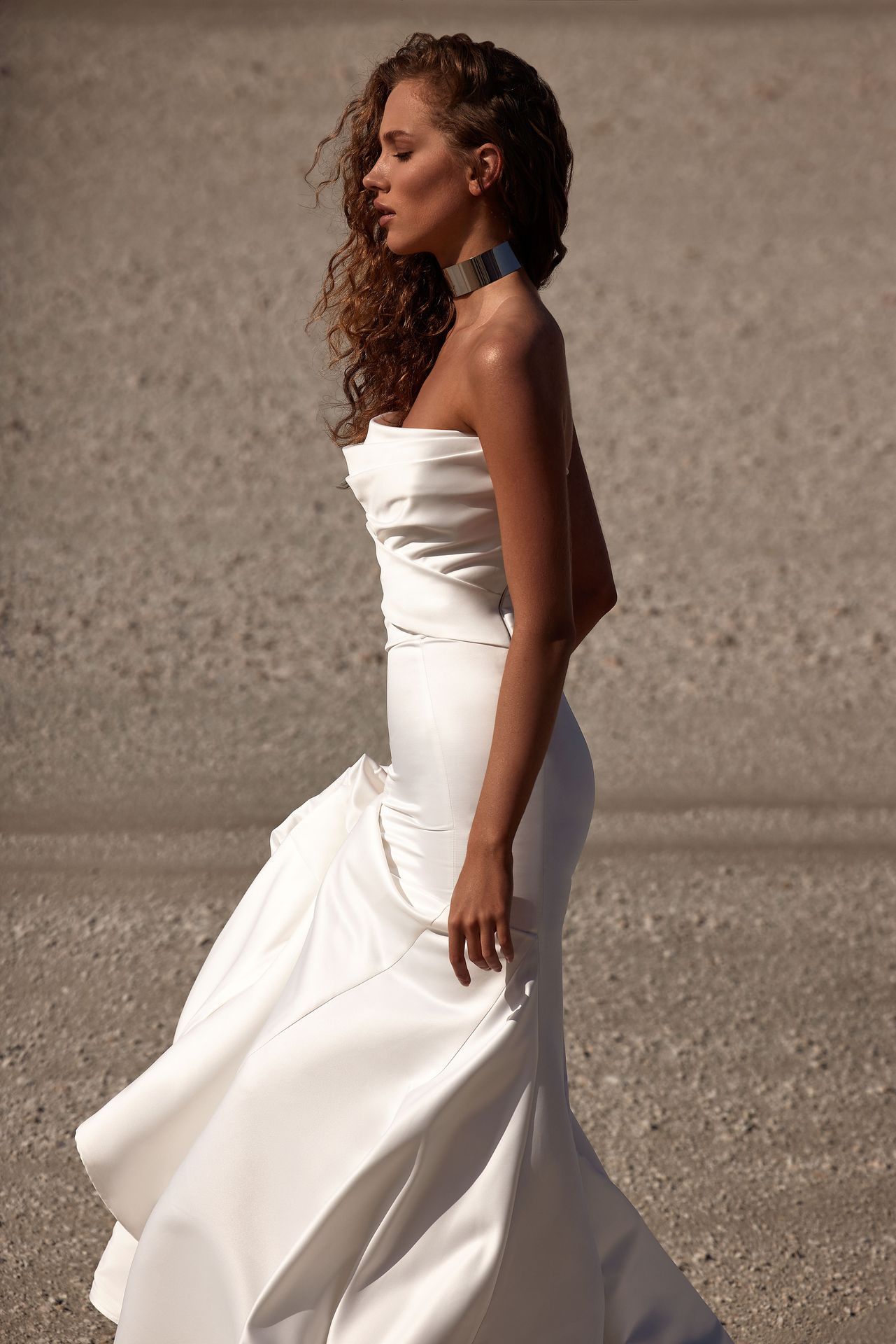 Sophisticated satin mermaid wedding gown with sculptural strapless silhouette and a long train. The figure-hugging style is finished with draped bodice and a long train.