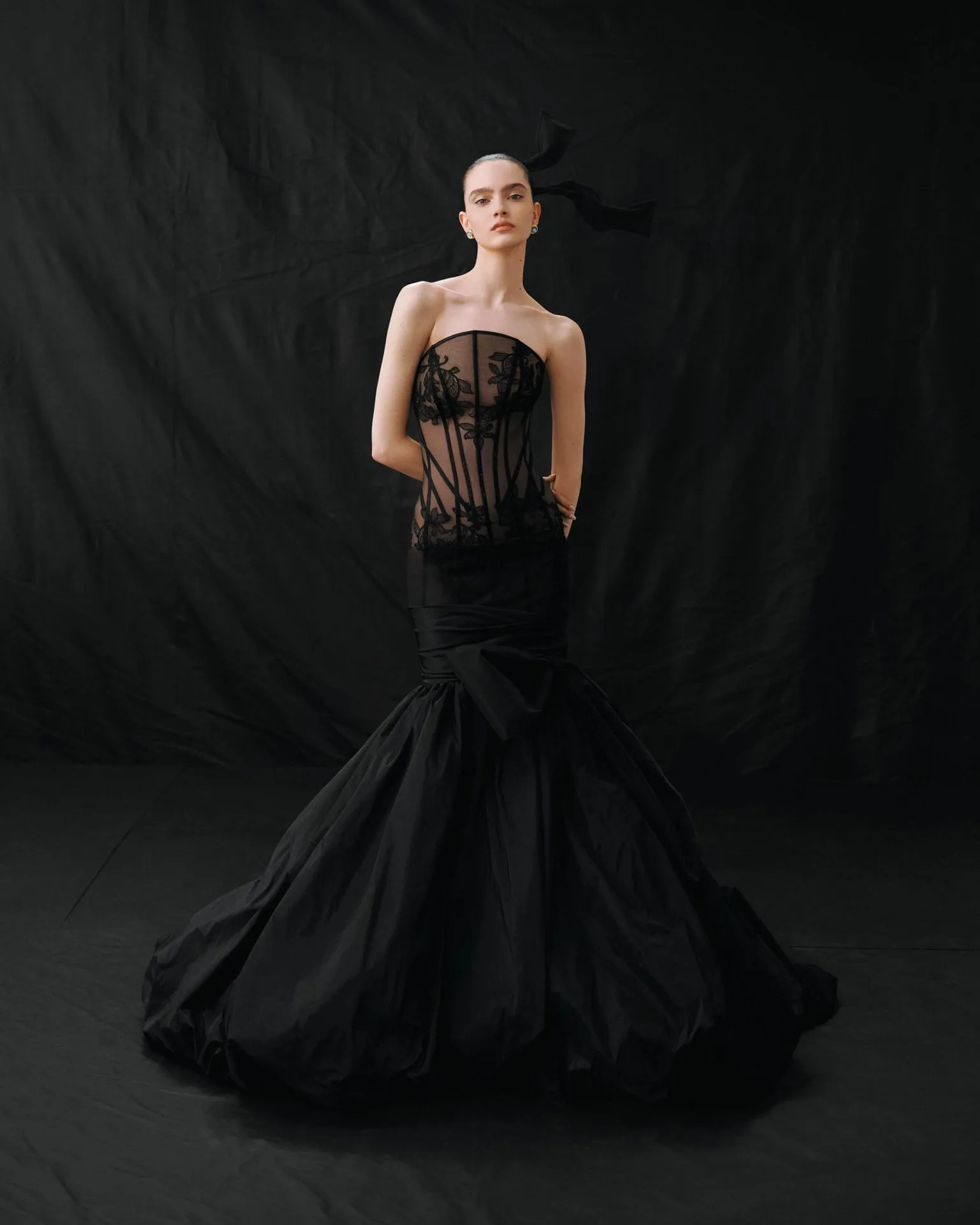 A black strapless gown with a sharply sculpted silhouette, combining a sheer corset bodice with intricate lace detailing and a dramatic taffeta skirt. The fitted shape highlights the figure before opening into a voluminous mermaid hem with sculptural draping, creating a look that feels bold, sensual, and unmistakably statement-making. Finished with a lace-up back.