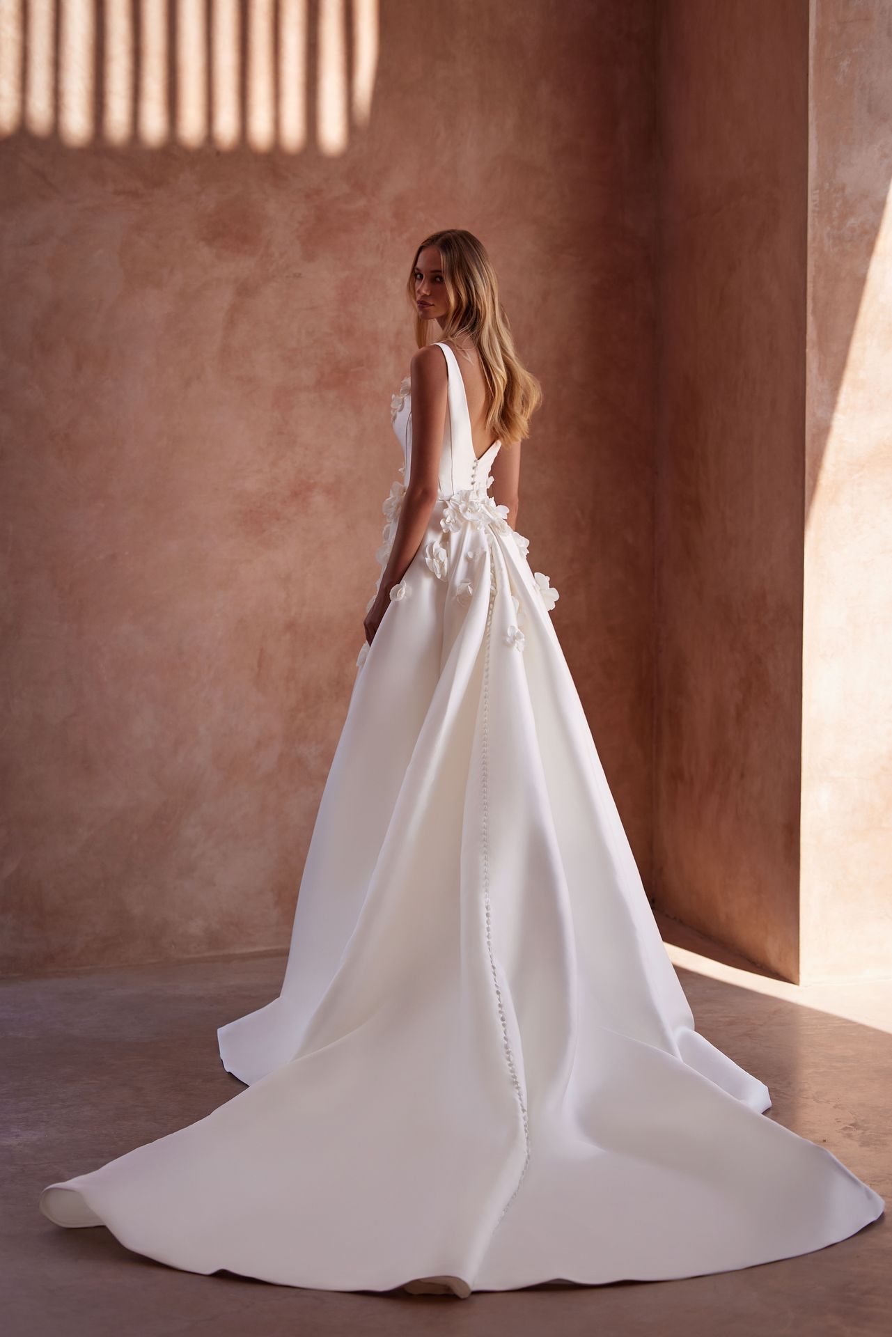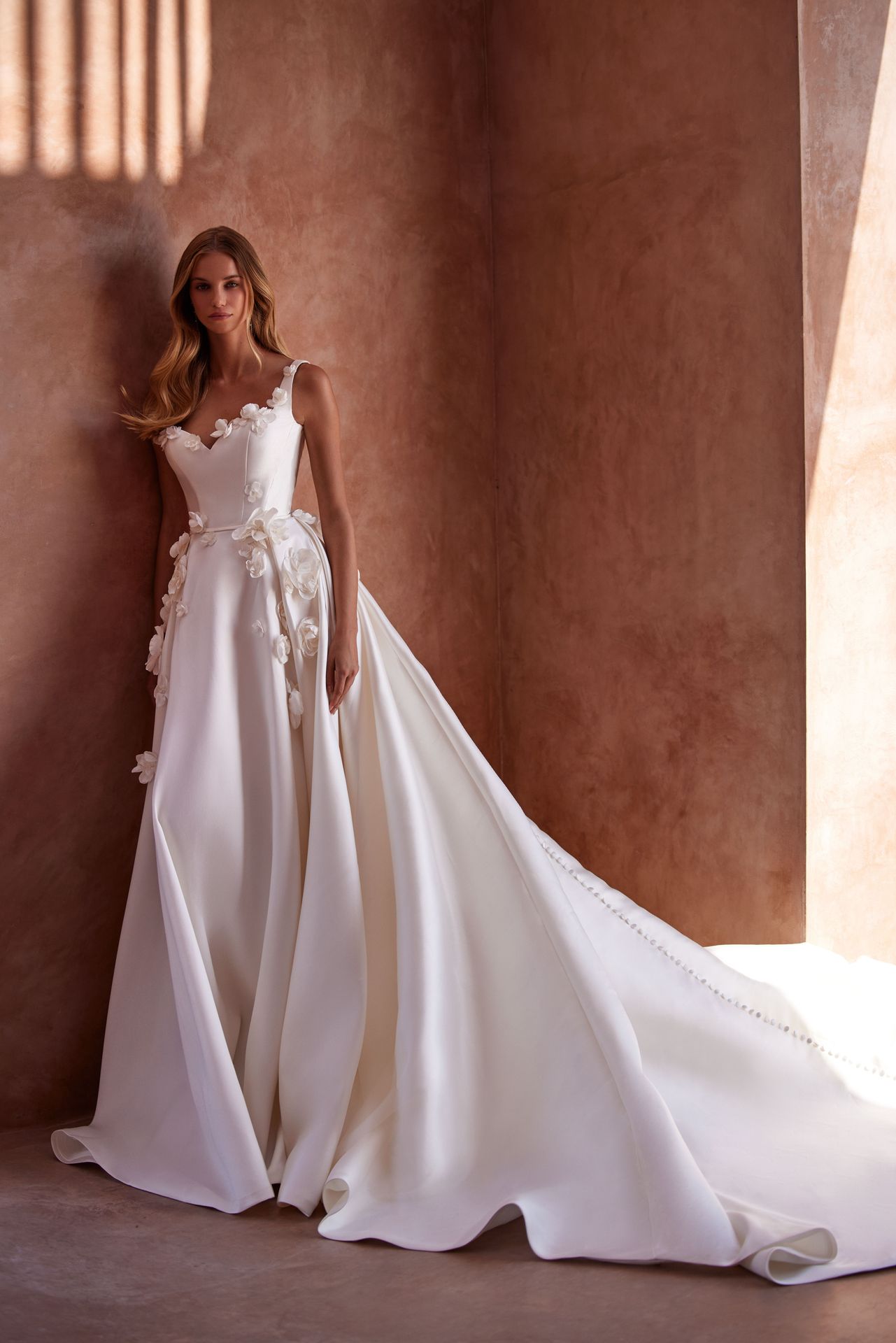 Sophisticated mikado wedding gown adorned with 3D lace flowers on the neckline.