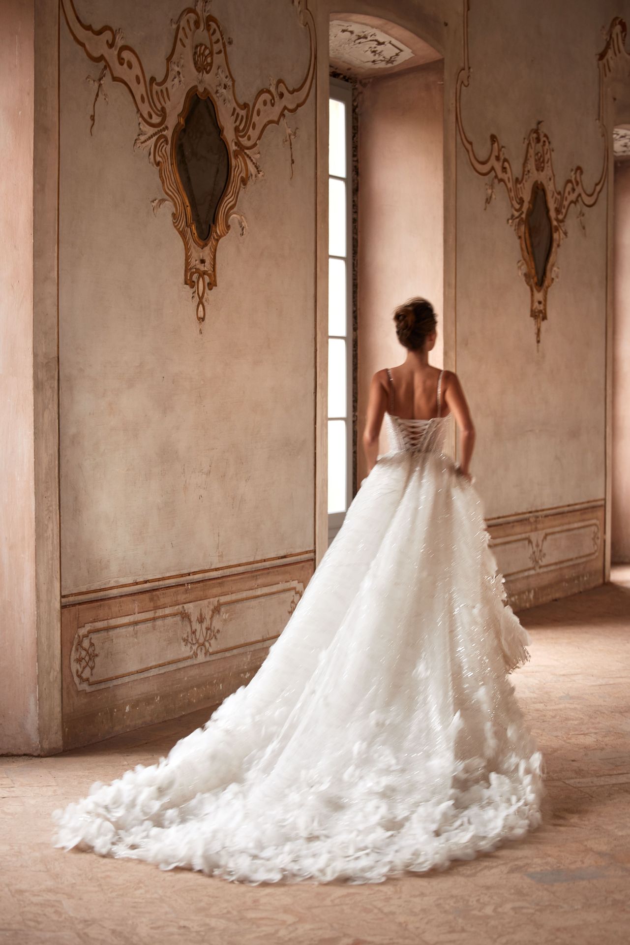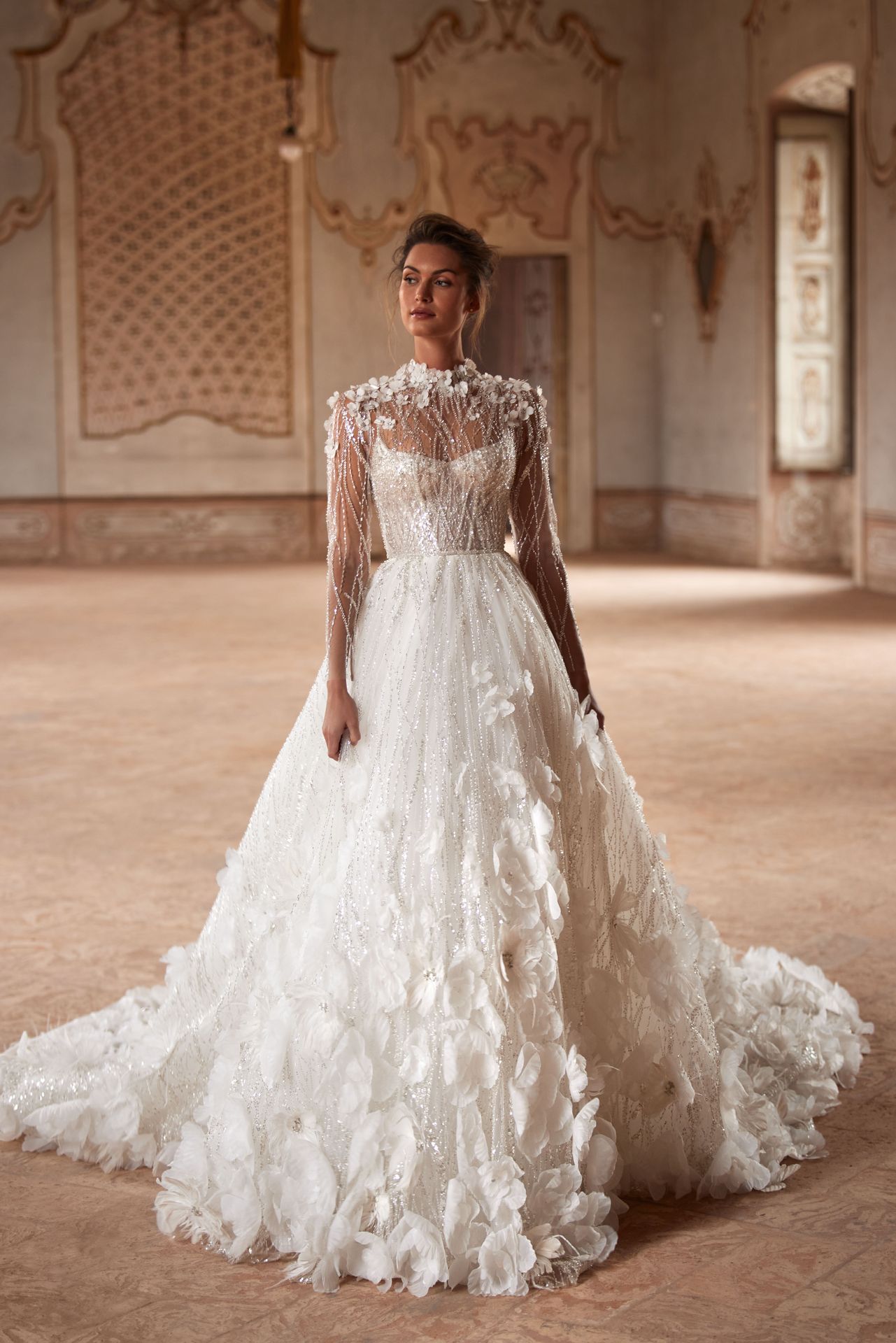 Couture princess gown fully adorned in sequins and volumetric floral applique. Featuring embroidered heart-shaped boned corset on spaghetti straps, a floral appliqué bustier, and a full skirt made from dozens of lace fabrics decorated with 3D flowers, feathers, and sequins. To complete the look, add a turtleneck sheer bolero imaginatively embroidered with sequins and 3D flower appliqués