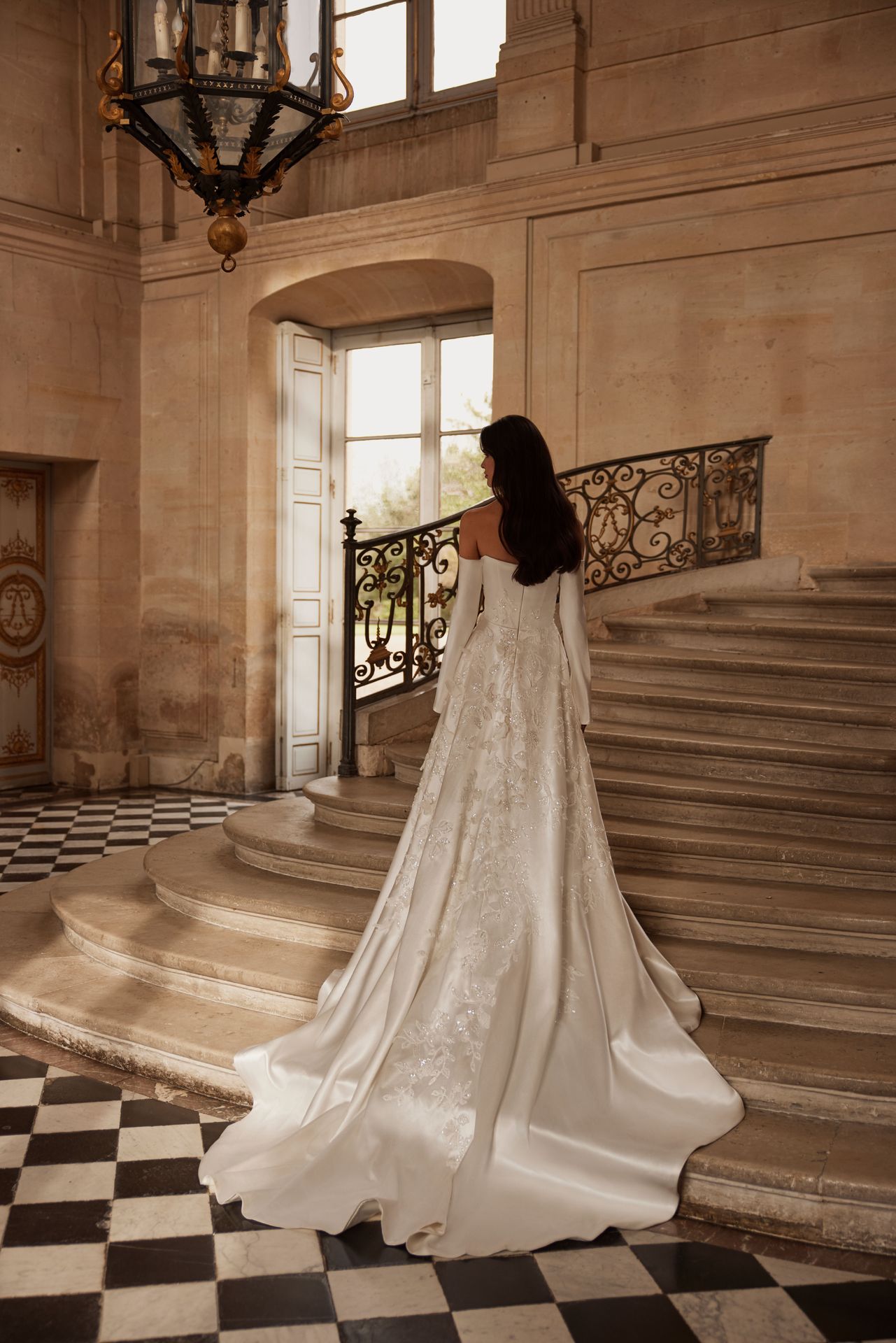 Perfect for a lush ceremony off-the-shoulder wedding gown designed in an A-line silhouette embellished by hand with pearls, beads, and 3D flowers. Featuring a straight neckline, off-the-shoulder long sleeves, and shiny 3D floral appliques that adorn both the corset and the maxi skirt with an opulent train.