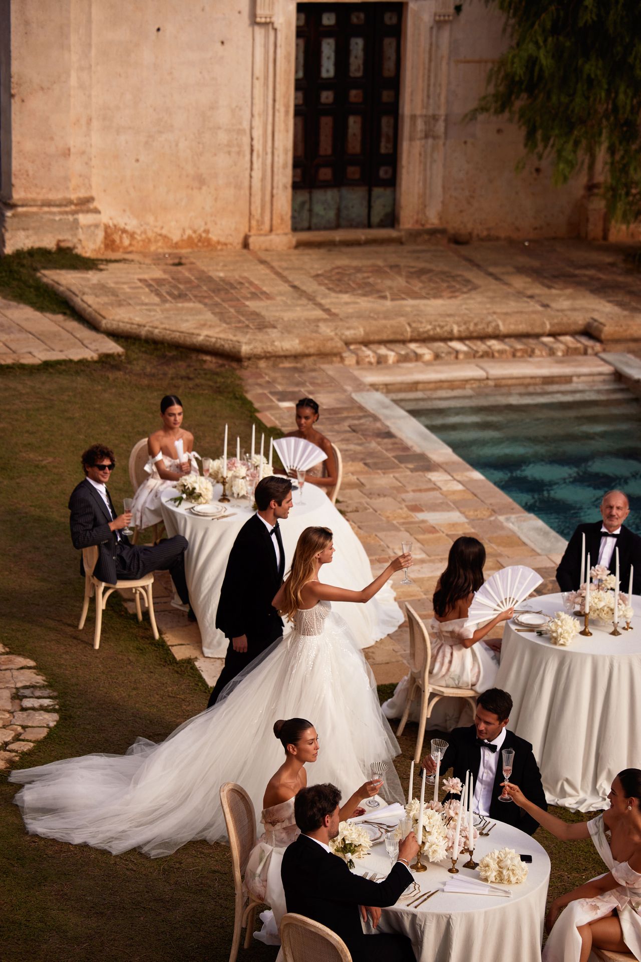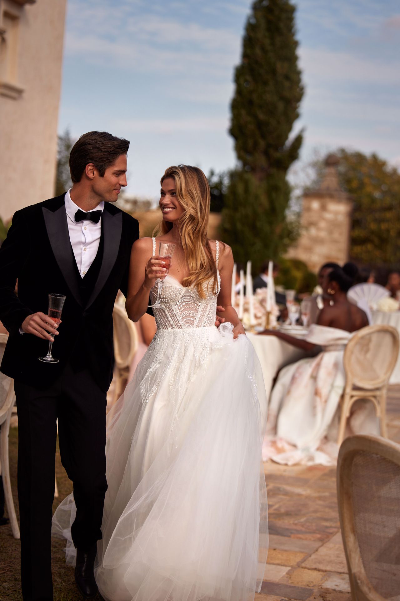 Delicate A-line wedding gown on spaghetti straps adorned with sequins and pearls. The structured corset complements and accentuates curves and has a deep heart-shaped neckline, pearl and sequin embellishment, and a lace-up closure on the back. The princess style is finished with a maxi tulle skirt and a short train.