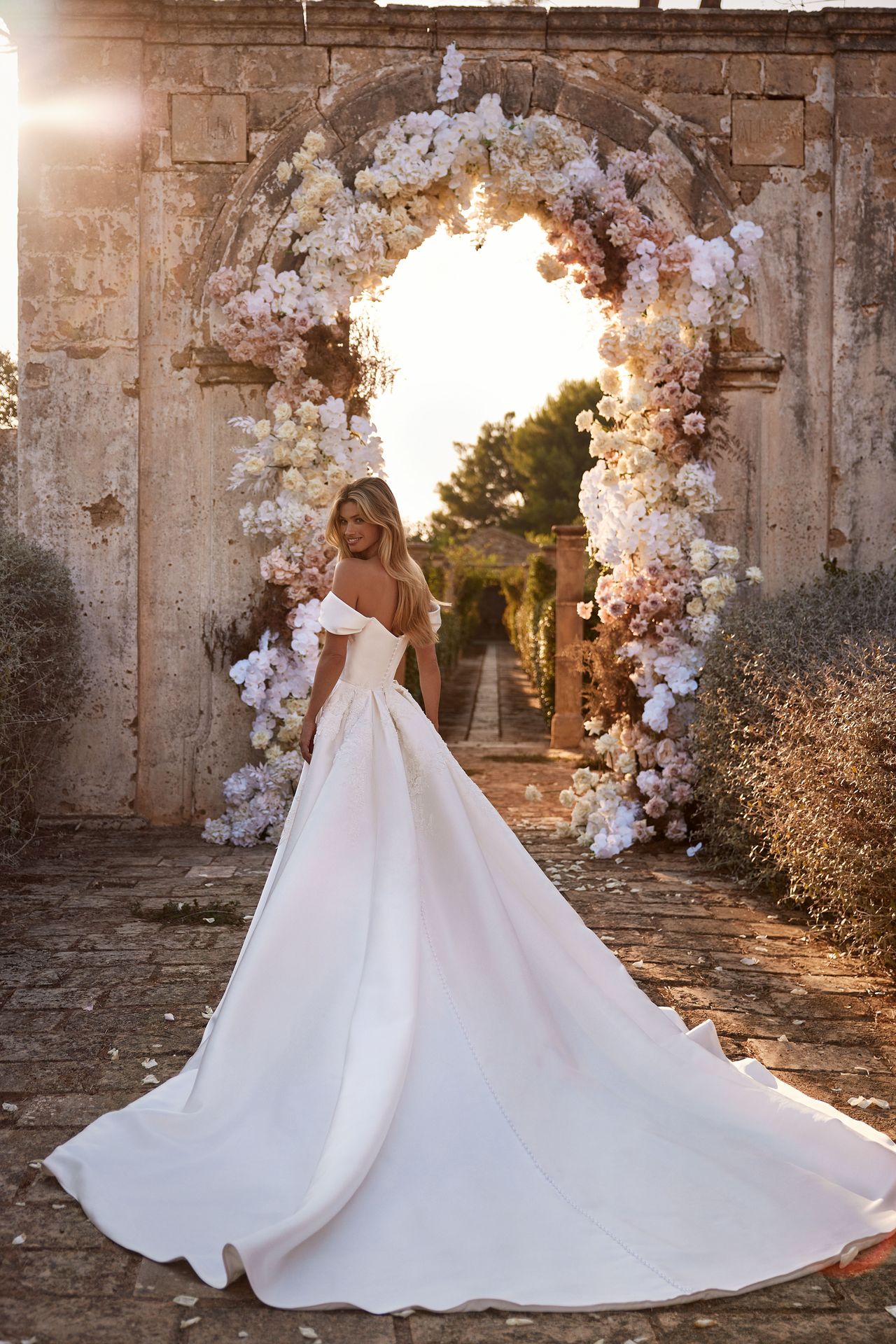 Outstanding princess wedding gown crafted from lux satin and hand-embroidered with floral lace and sequins. Featuring an off-the-shoulder corset-style bodice gently ruched at the neckline and a full maxi skirt with a long cathedral train. This dress stands out for its exceptional design, featuring our debut in hand embroidery of lace on the satin.