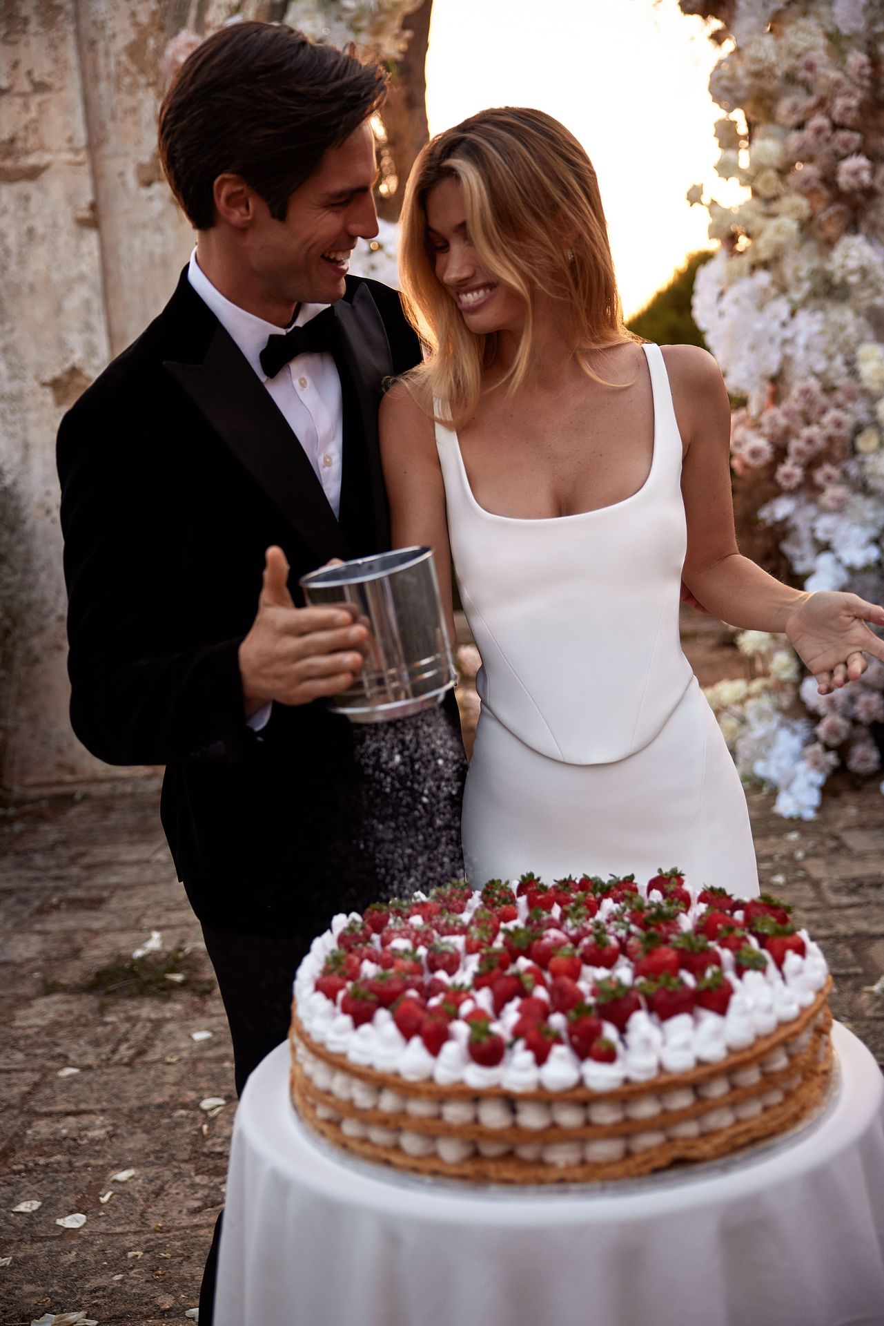 Sophisticated contemporary two-piece wedding look. The bodice on wide straps features a cinched waist and boat neckline. The ensemble is finished with a flowy skirt with an alluring side slit and a midi train. The look is timeless and can be worn as a second wedding outfit, or later used separately for a casual look.