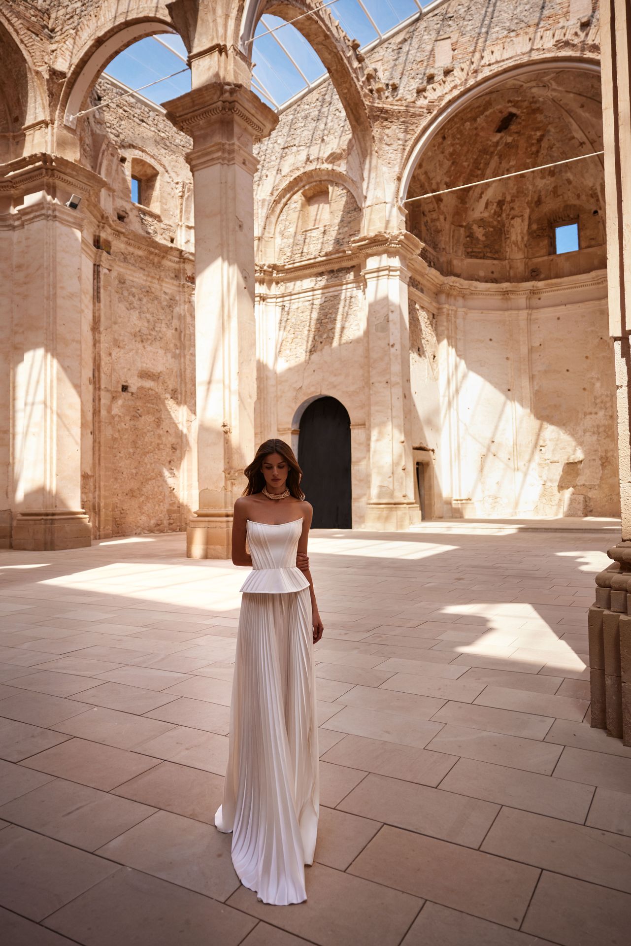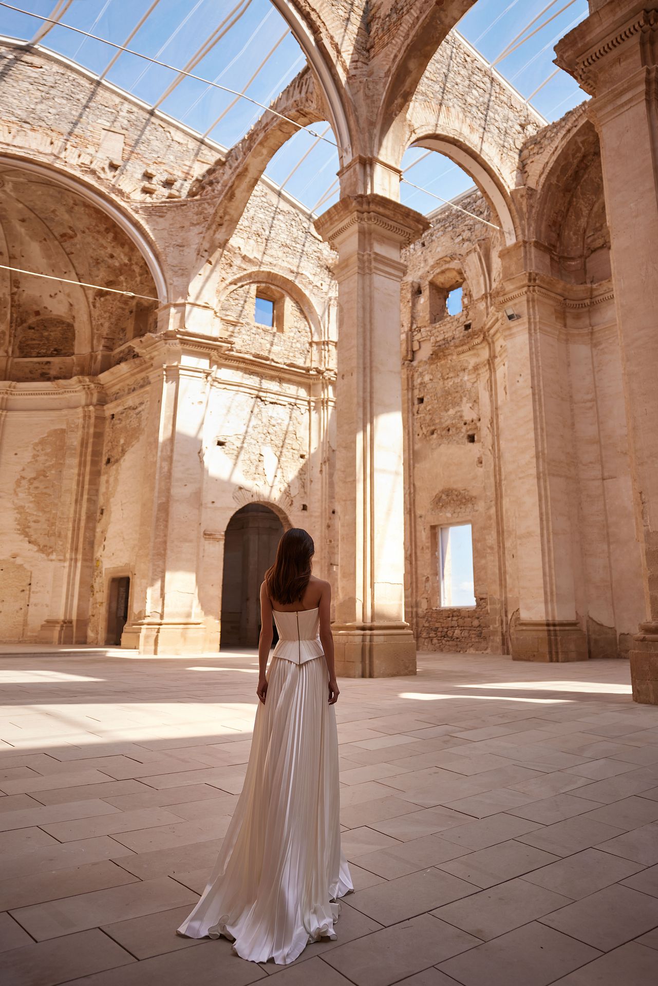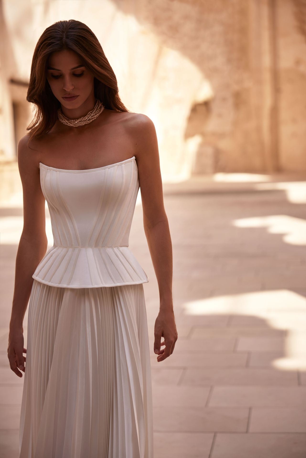 Victorian-era aesthetic with a modern feel blends together in this two-piece wedding look made of Italian silk. Featuring a classic boned corset with a geometrical neckline and a pleated flowy maxi skirt.