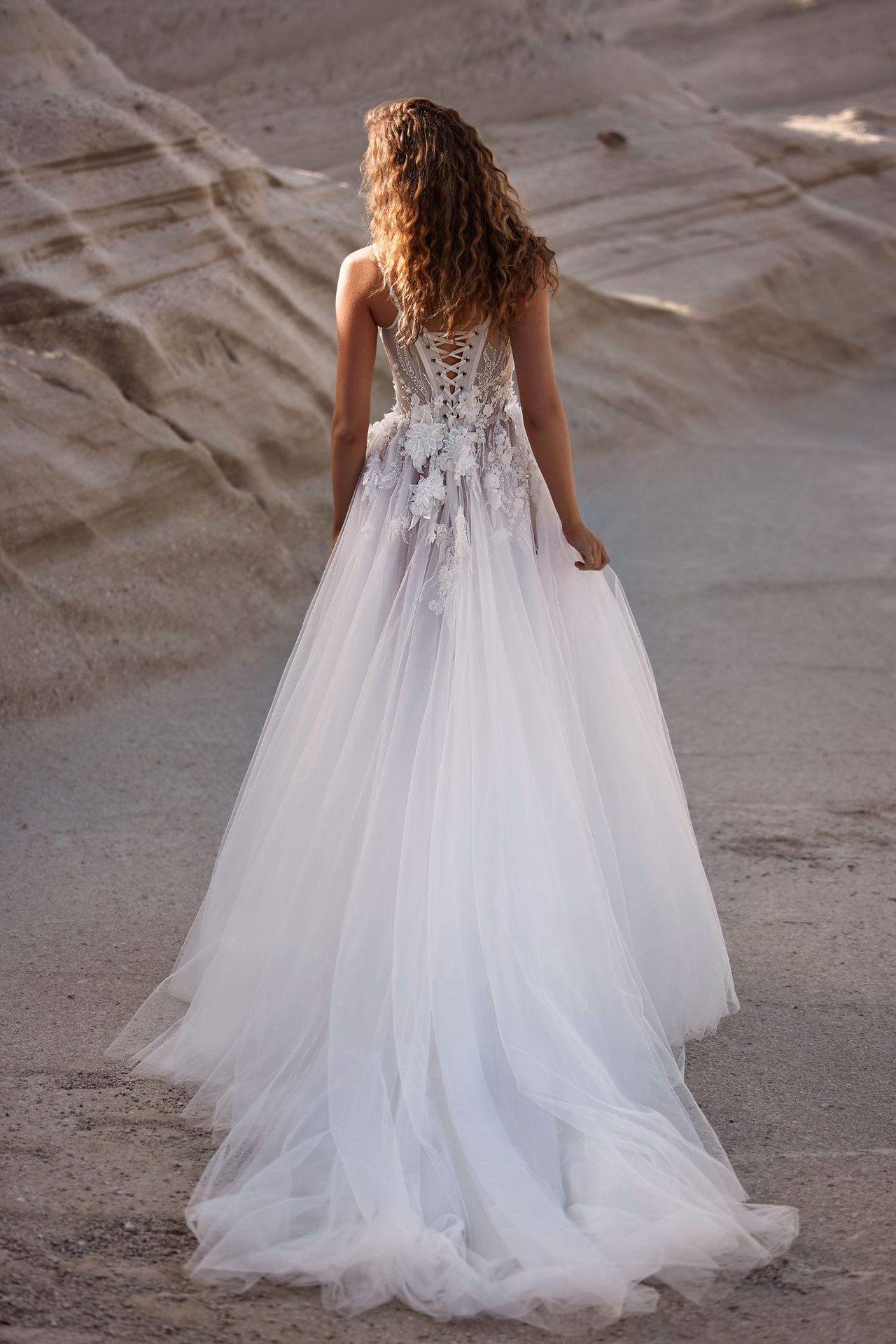 Featuring a heart-shaped corset with a lace-up closure on the back, a puffy tulle skirt with a daring side slit, and a long train.