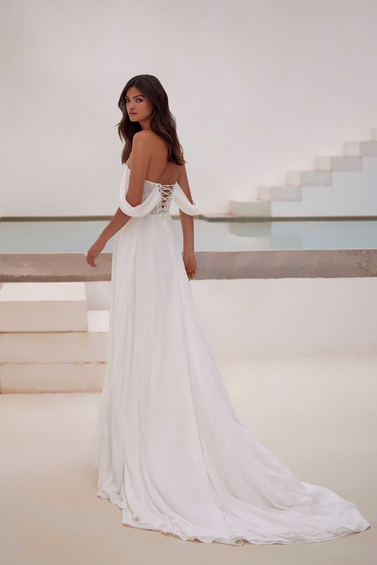 Graceful chiffon gown with a semi-transparent boned off-the-shoulder corset, sheer tulle sleeves, and lace-up or zipper closure on the back. A straight-silhouette maxi skirt features a straight side slit and a delicate train.