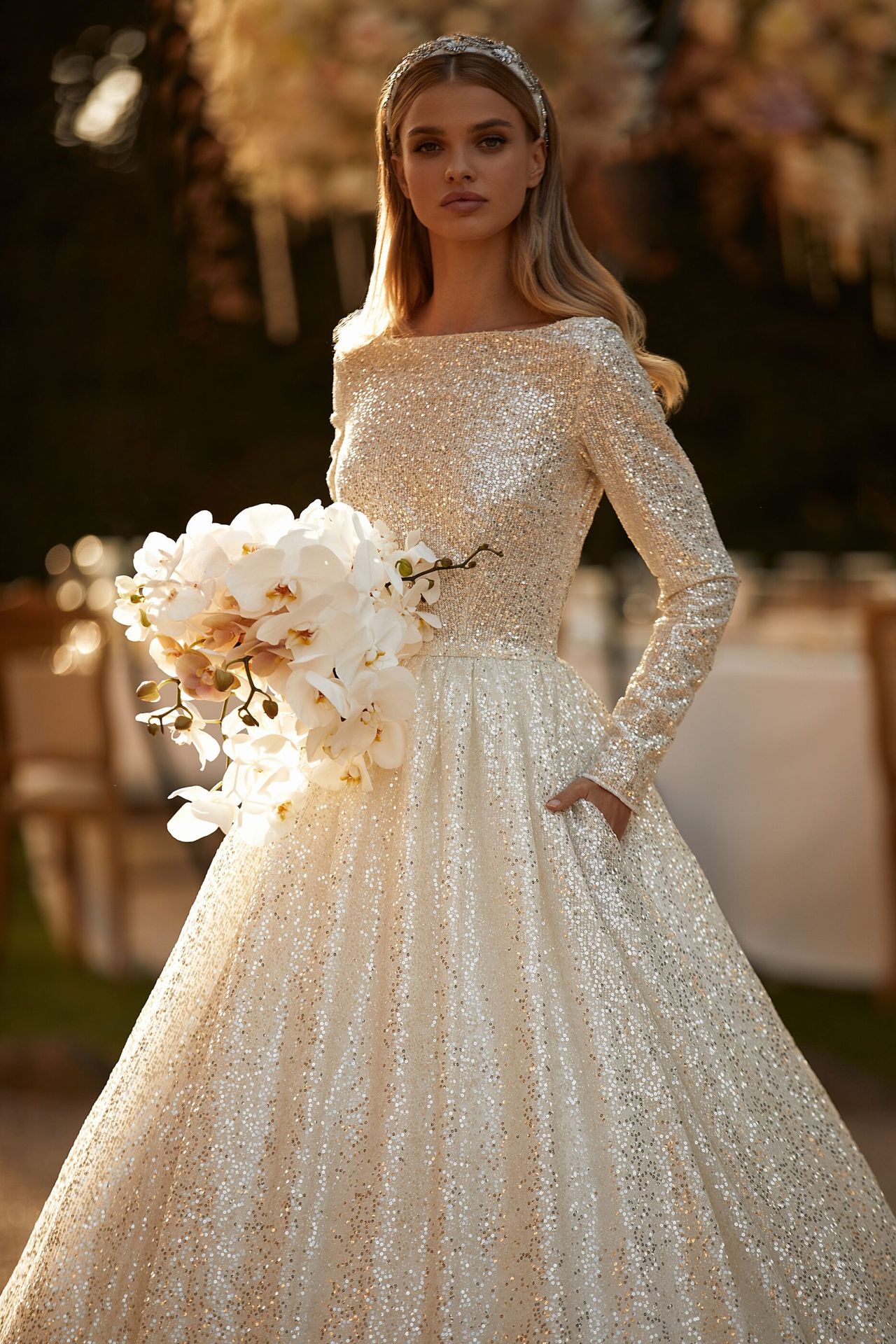 Silver sparkly ball gown with long-sleeved bodice, bateau neckline, and a full skirt with a long train.