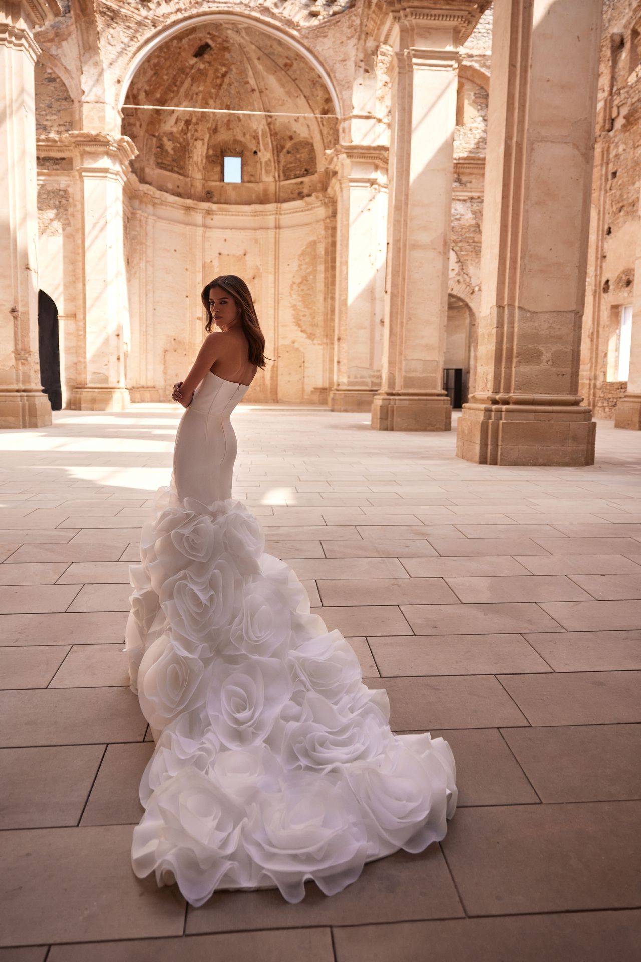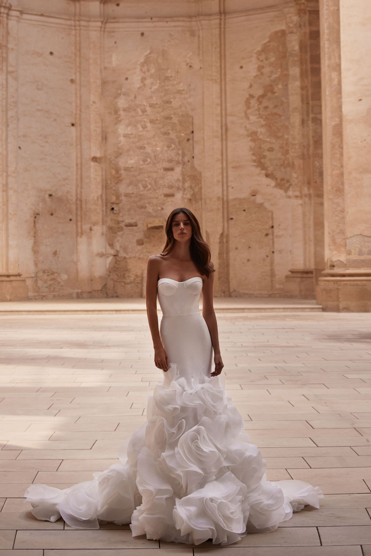 Voguish mermaid gown cut from the delicate gabardine. Featuring a bodycon silhouette, a structured sleeveless boned corset bodice, and is adorned by hand volumetric mermaid tale skirt with stunning handcrafted appliques.
