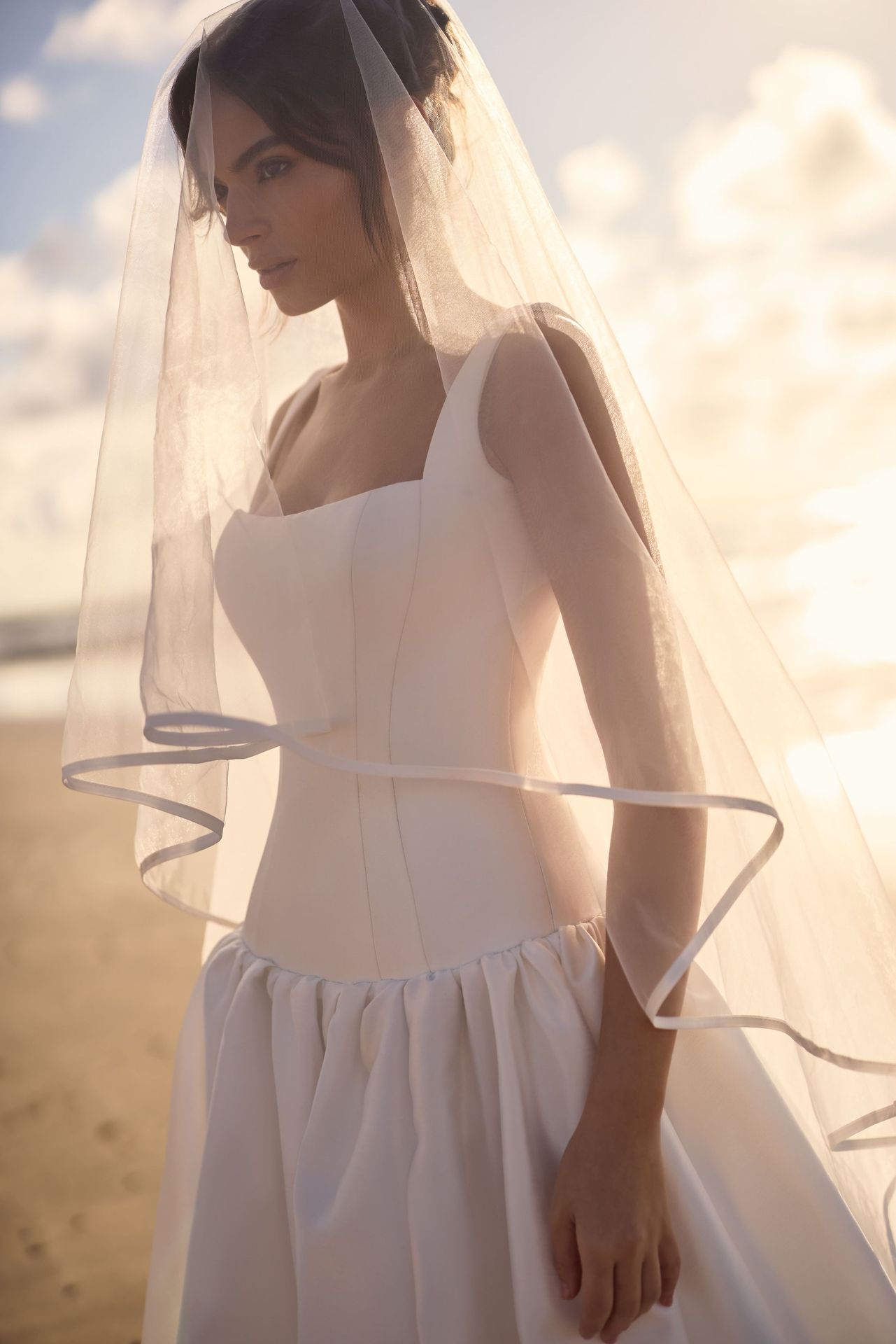 Minimalist drop-waist A-line wedding gown crafted from satin in a corset style. Featuring a square neckline framed by wide shoulder straps and a fitted bodice with a discreet zip closure at the fully covered back. The expansive skirt is beautifully gathered, flowing from a low waist into a maxi length with a stunning long train. The gown is available with or without a side slit. Comes with a detachable pearl accessory that accentuates the waistline and brings a touch of romance to the look. Can be complemented with Tousaint veil.